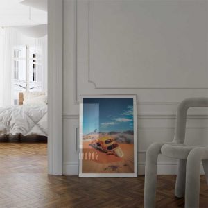 Capture the haunting beauty of Namibia’s desert in this evocative wall print, featuring an old yellow car, rusting gracefully beneath layers of golden sand.