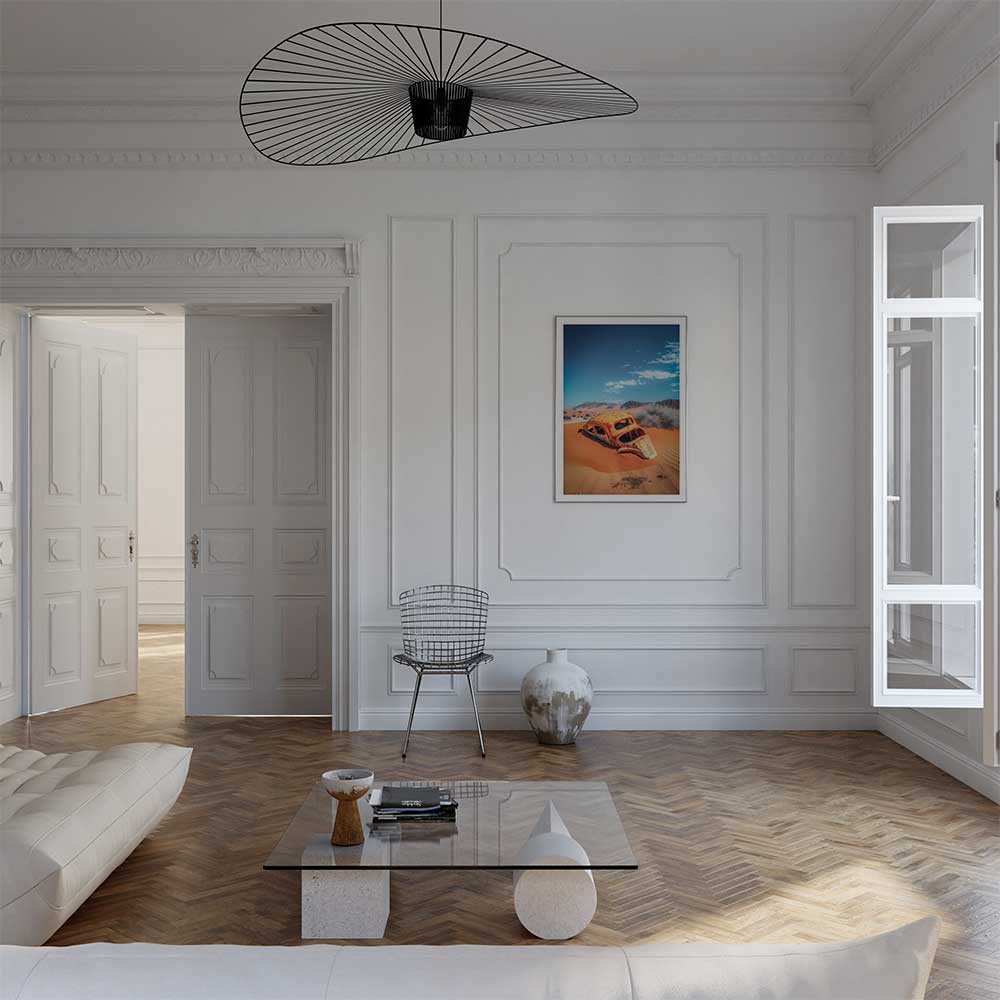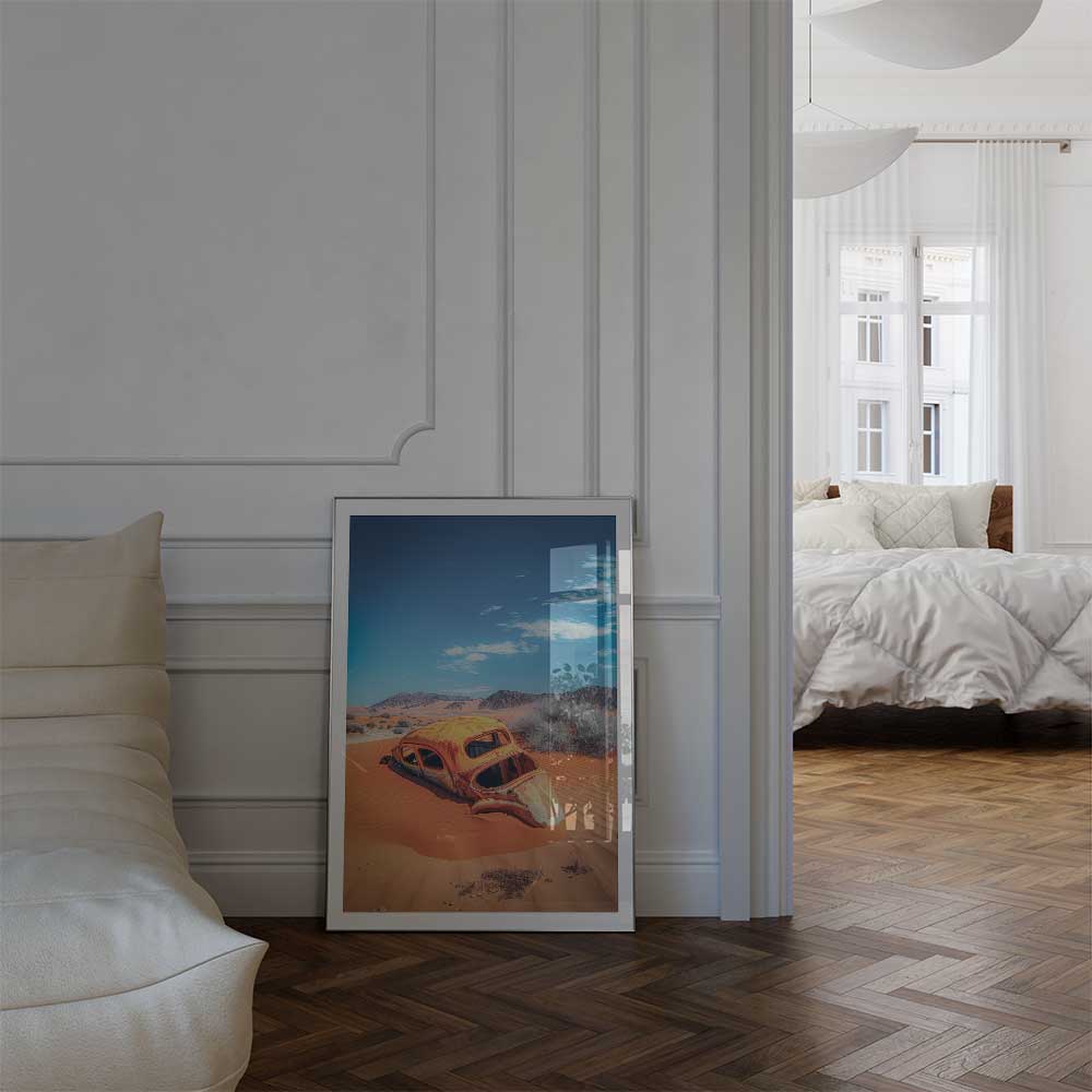 Choose from three premium paper options — Museum-quality, Premium, or Classic — each designed to highlight the intricate details of the car and the warm, soft tones of the desert.