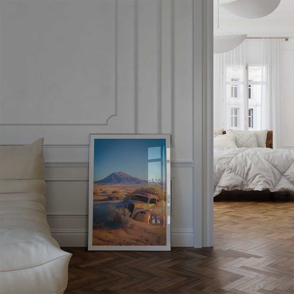 Choose from three premium paper options — Museum-quality, Premium, or Classic — each designed to highlight the intricate details of the car and the warm, soft tones of the desert.