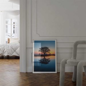 Immerse yourself in the serene beauty of Africa’s wilderness with this captivating wall print, featuring a solitary tree silhouetted by the rising sun, its reflection mirrored perfectly in the still waters below.