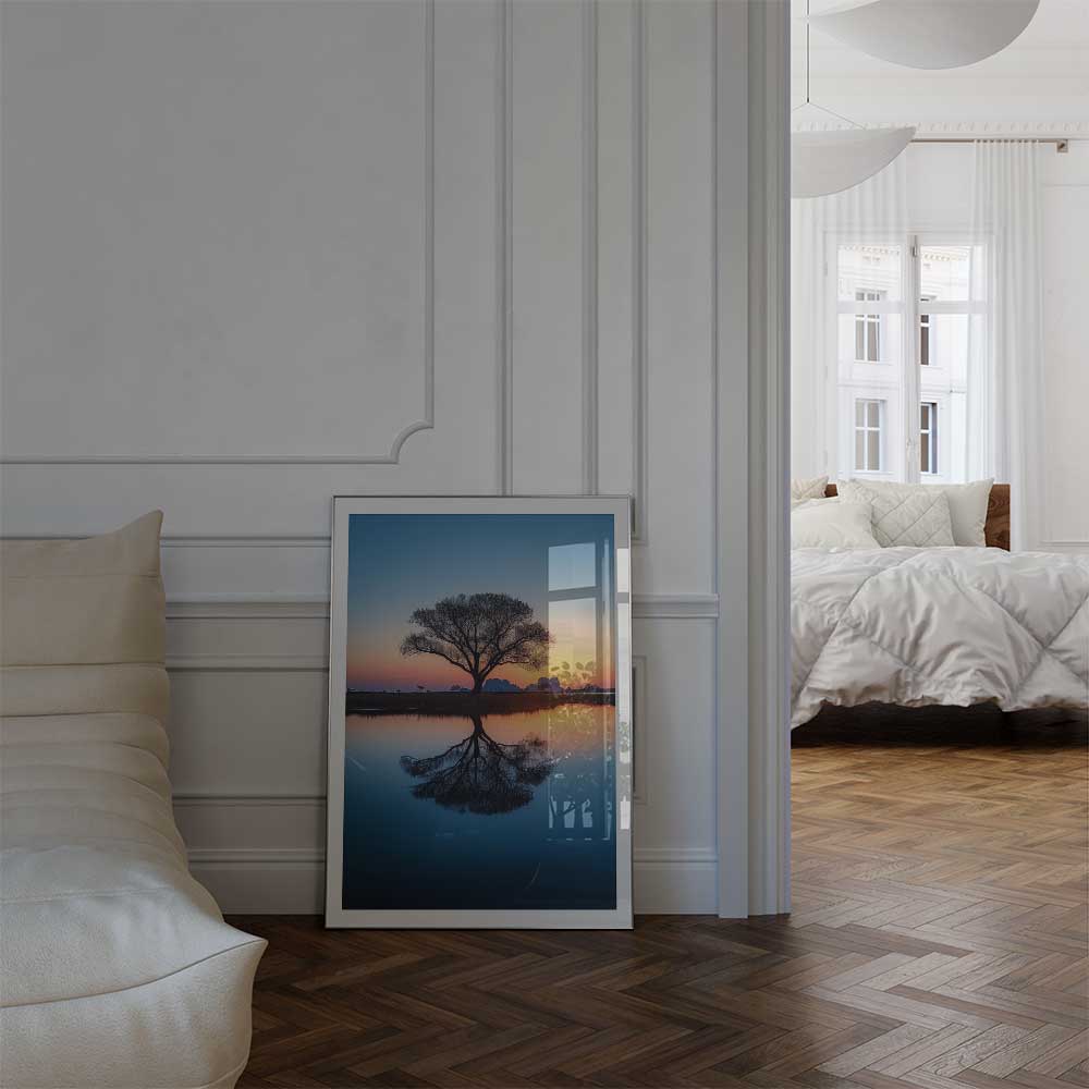 Immerse yourself in the serene beauty of Africa’s wilderness with this captivating wall print, featuring a solitary tree silhouetted by the rising sun, its reflection mirrored perfectly in the still waters below.