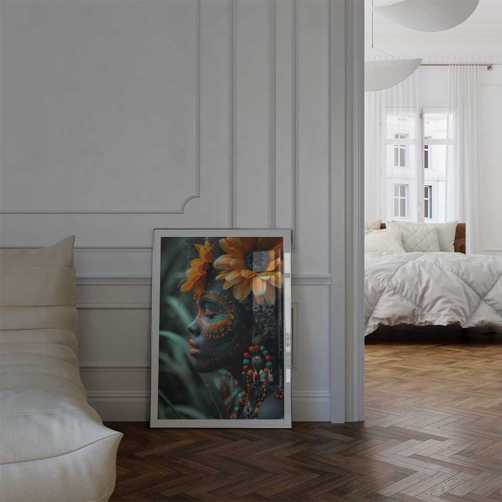 Capture the elegance and vibrant spirit of Sudanese beauty with this striking wall print, featuring a graceful woman adorned with flowers in her hair and colorful beaded earrings. The image radiates cultural richness and natural beauty, bringing an exotic touch to any space.