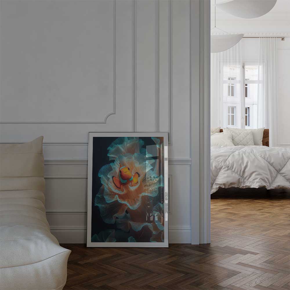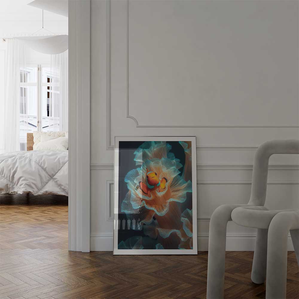 Bring the vibrant beauty of the underwater world into your space with this captivating portrait of a clownfish nestled among the flowing tentacles of a sea anemone. This artwork captures the perfect harmony of color and movement, showcasing the symbiotic relationship between these fascinating marine creatures.