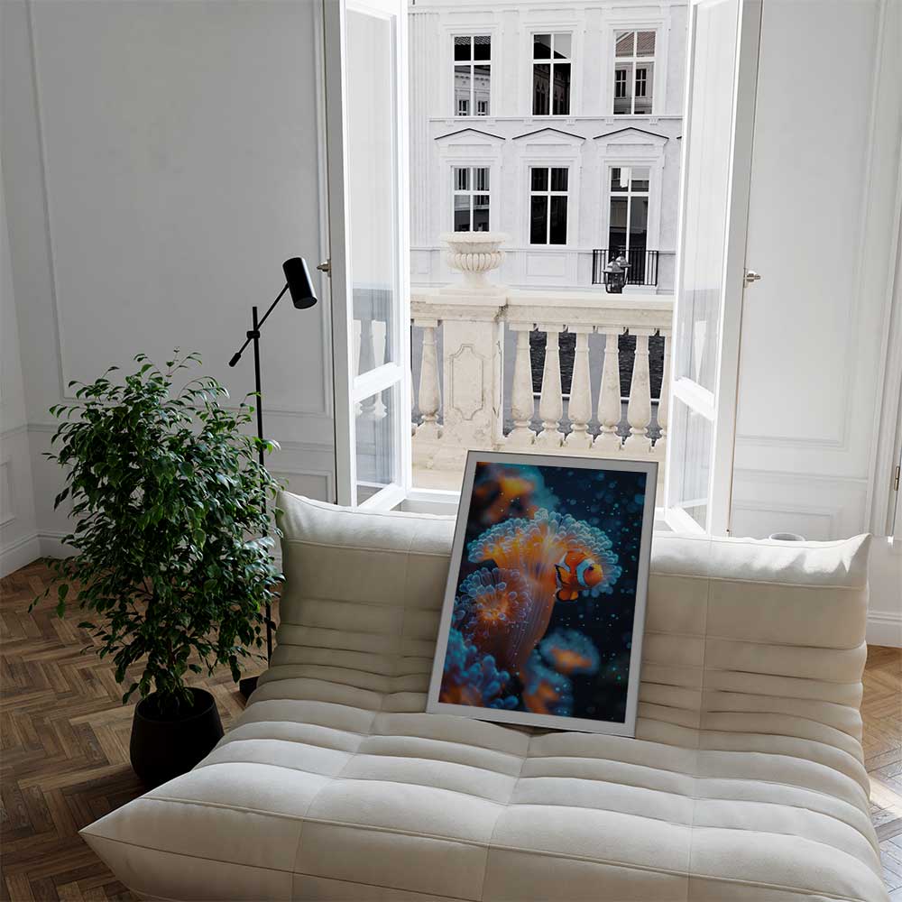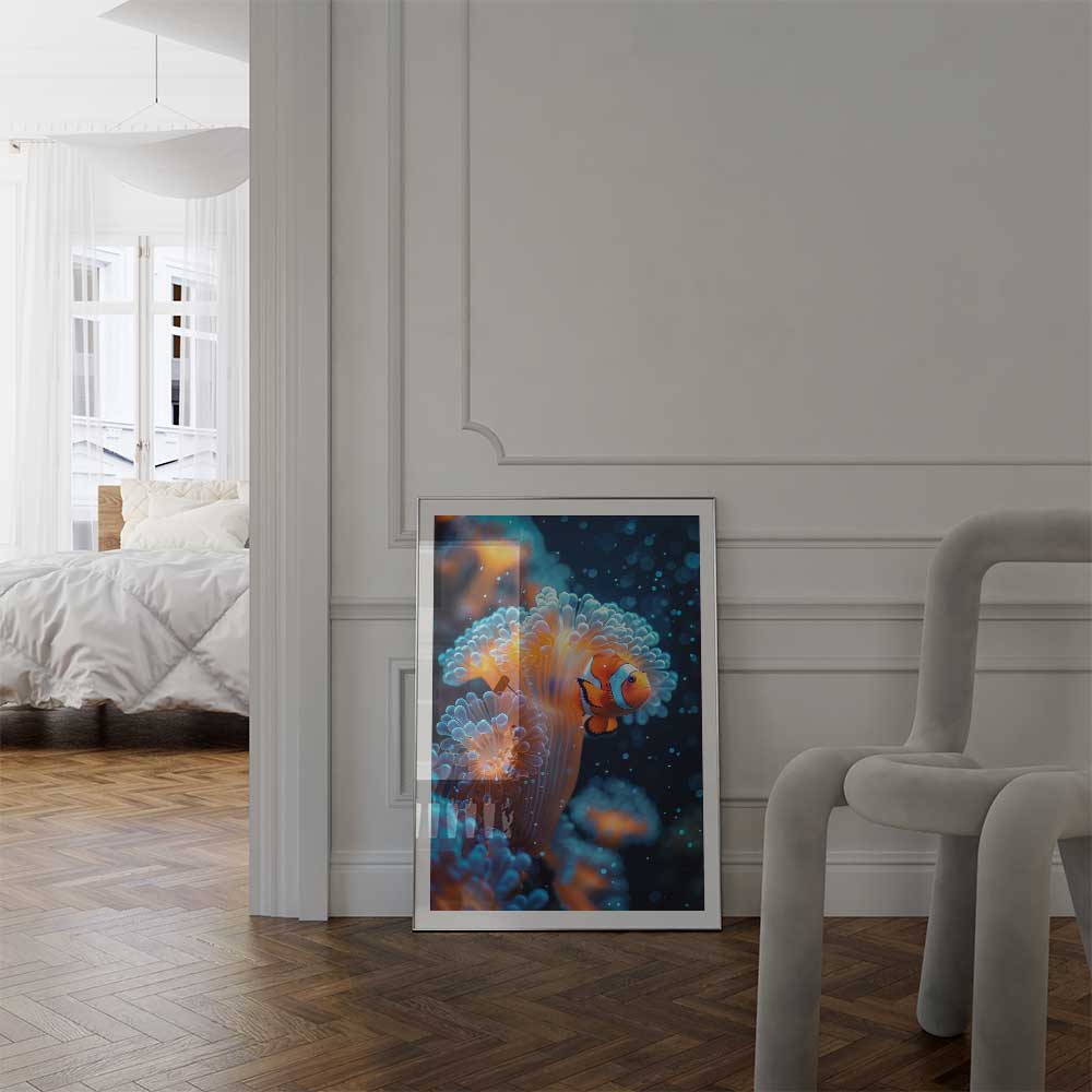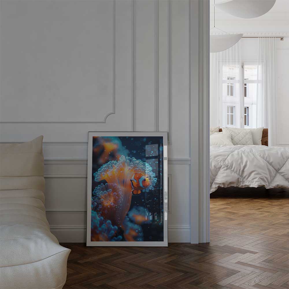 Bring the vibrant beauty of the underwater world into your space with this captivating portrait of a clownfish nestled among the flowing tentacles of a sea anemone. This artwork captures the perfect harmony of color and movement, showcasing the symbiotic relationship between these fascinating marine creatures.