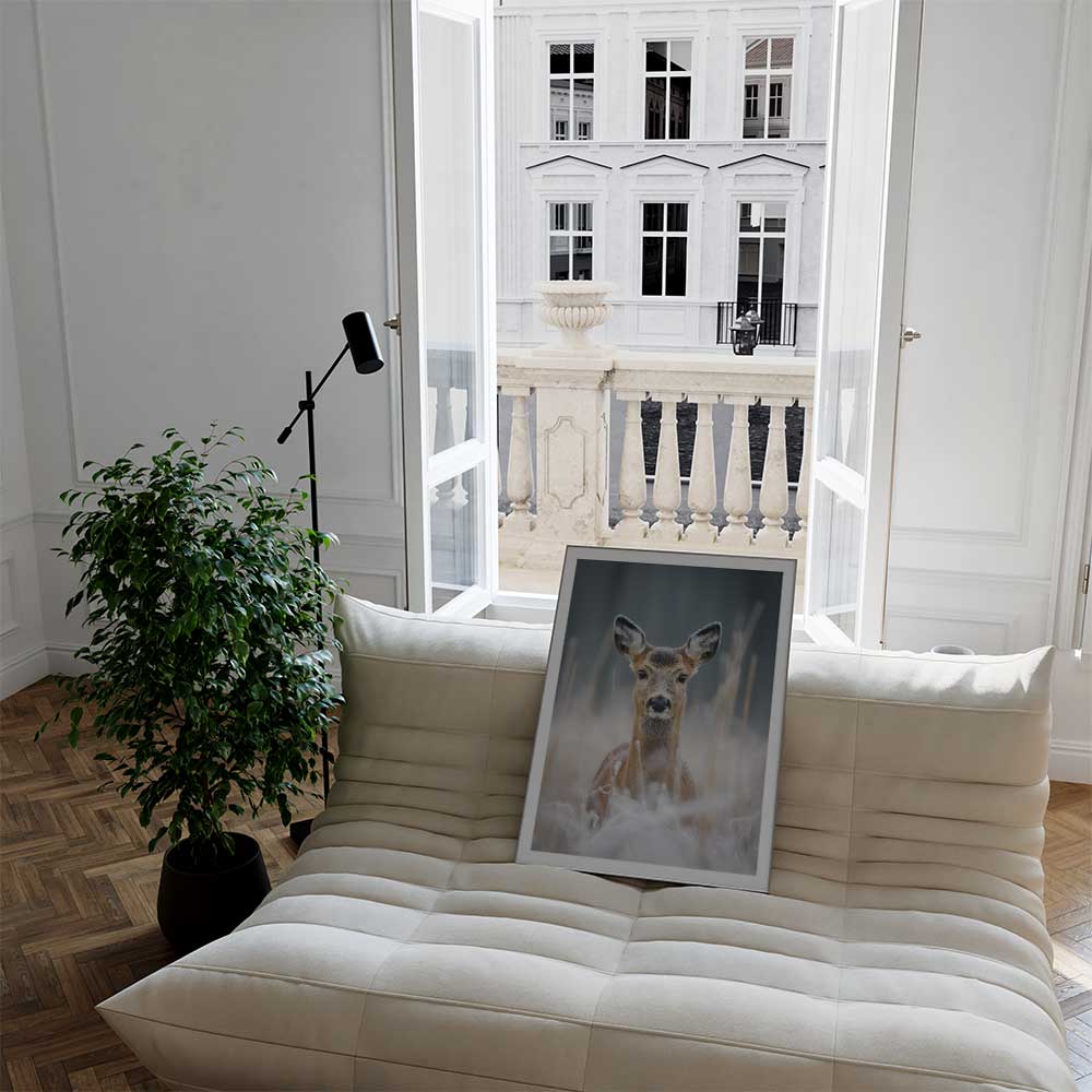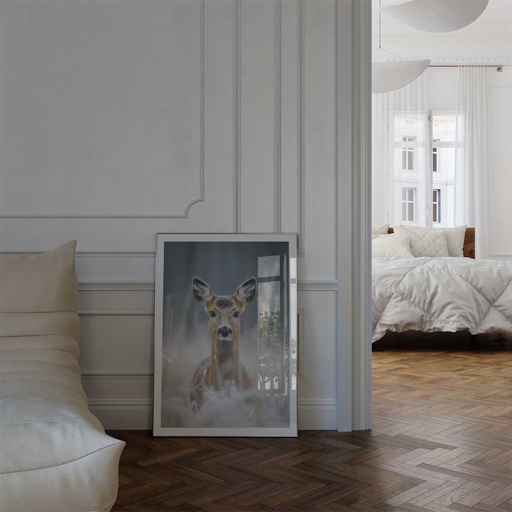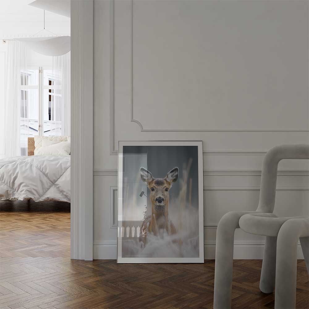 Experience the untamed beauty of the Scottish Highlands with this captivating wall print featuring a majestic deer in its natural habitat.