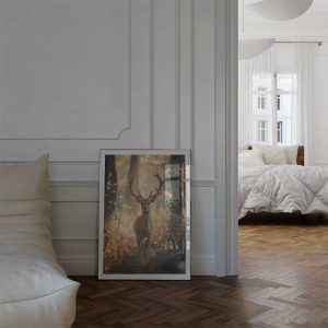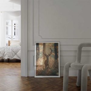 Experience the untamed beauty of the Scottish Highlands with this captivating wall print featuring a majestic deer in its natural habitat.