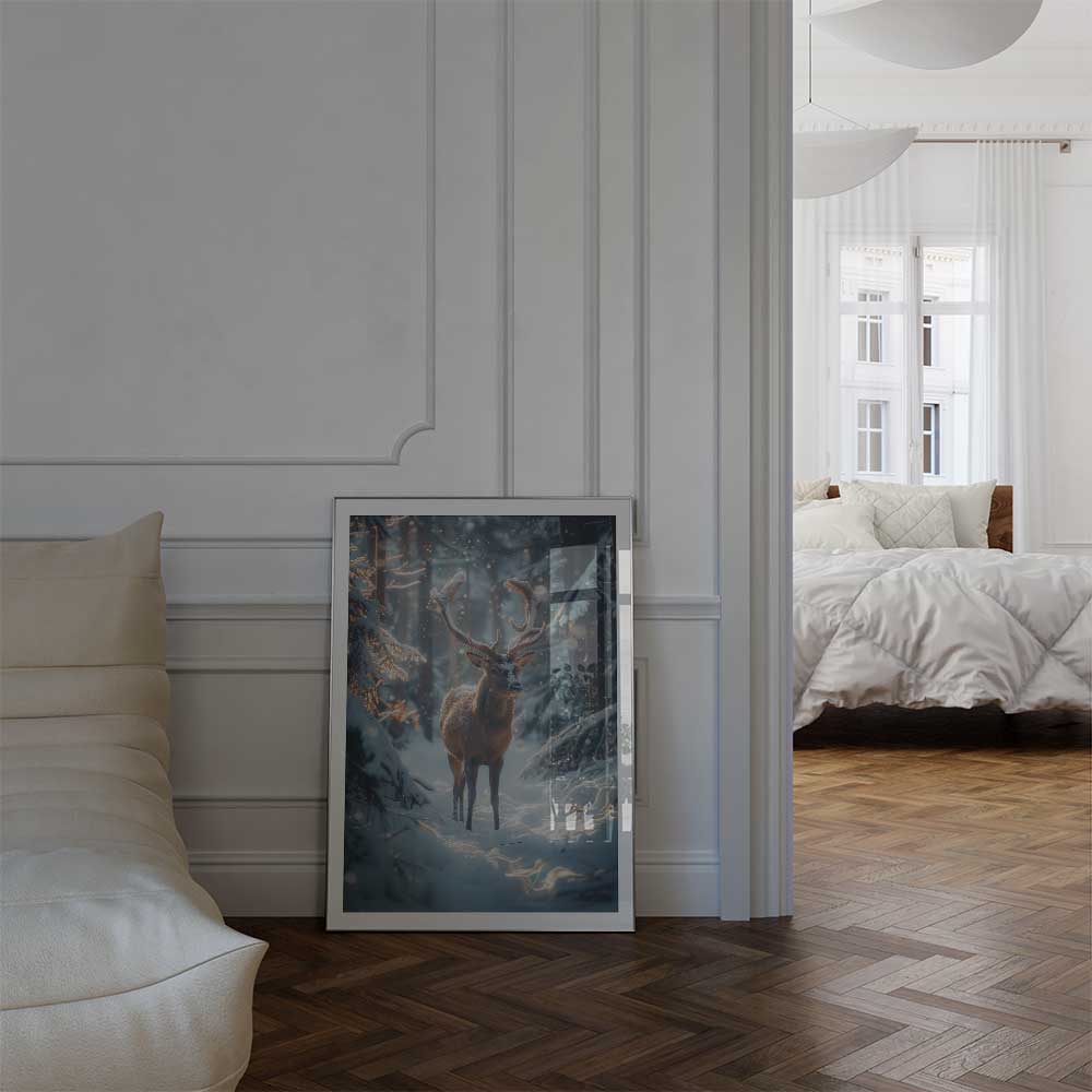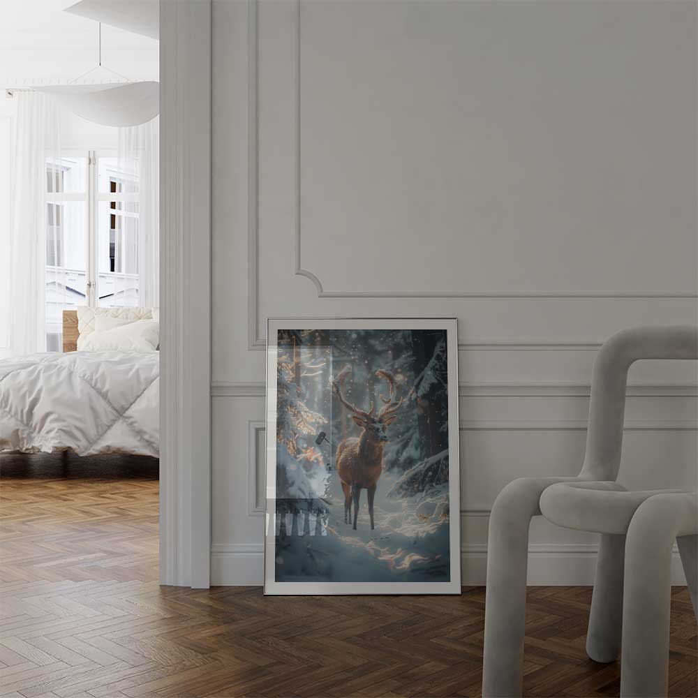 Experience the untamed beauty of the Scottish Highlands with this captivating wall print featuring a majestic deer in its natural habitat.