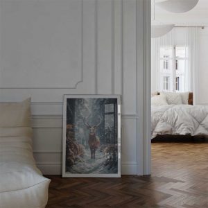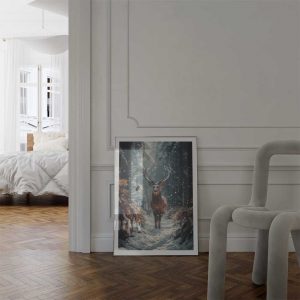 Experience the untamed beauty of the Scottish Highlands with this captivating wall print featuring a majestic deer in its natural habitat.