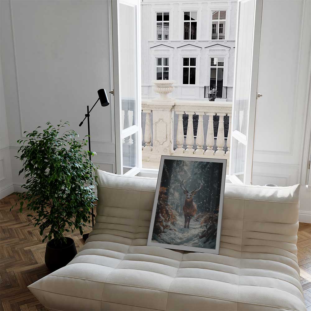 Experience the untamed beauty of the Scottish Highlands with this captivating wall print featuring a majestic deer in its natural habitat.