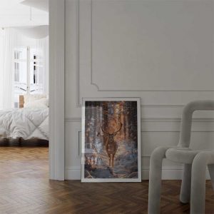 Experience the untamed beauty of the Scottish Highlands with this captivating wall print featuring a majestic deer in its natural habitat.