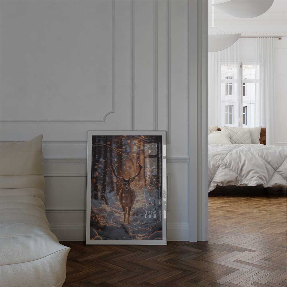 Experience the untamed beauty of the Scottish Highlands with this captivating wall print featuring a majestic deer in its natural habitat.