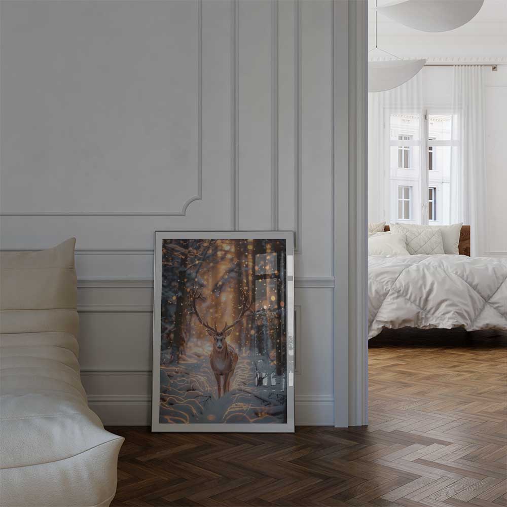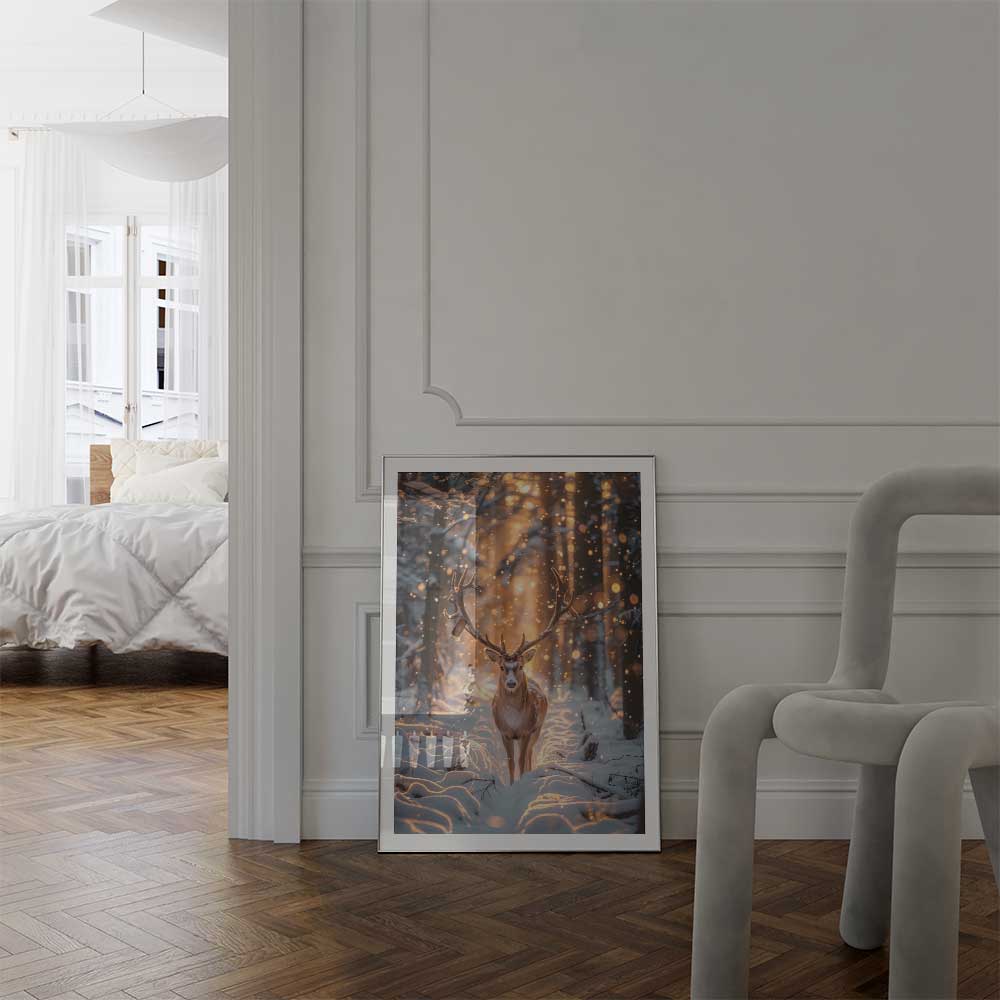 Experience the untamed beauty of the Scottish Highlands with this captivating wall print featuring a majestic deer in its natural habitat.