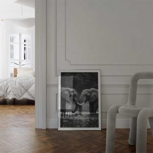 Experience the profound connection of Africa’s wilderness with this captivating wall print, featuring two African Elephants standing head to head in a serene river scene. This portrait captures their gentle strength and unity against a stunning natural backdrop.