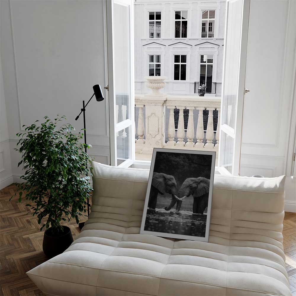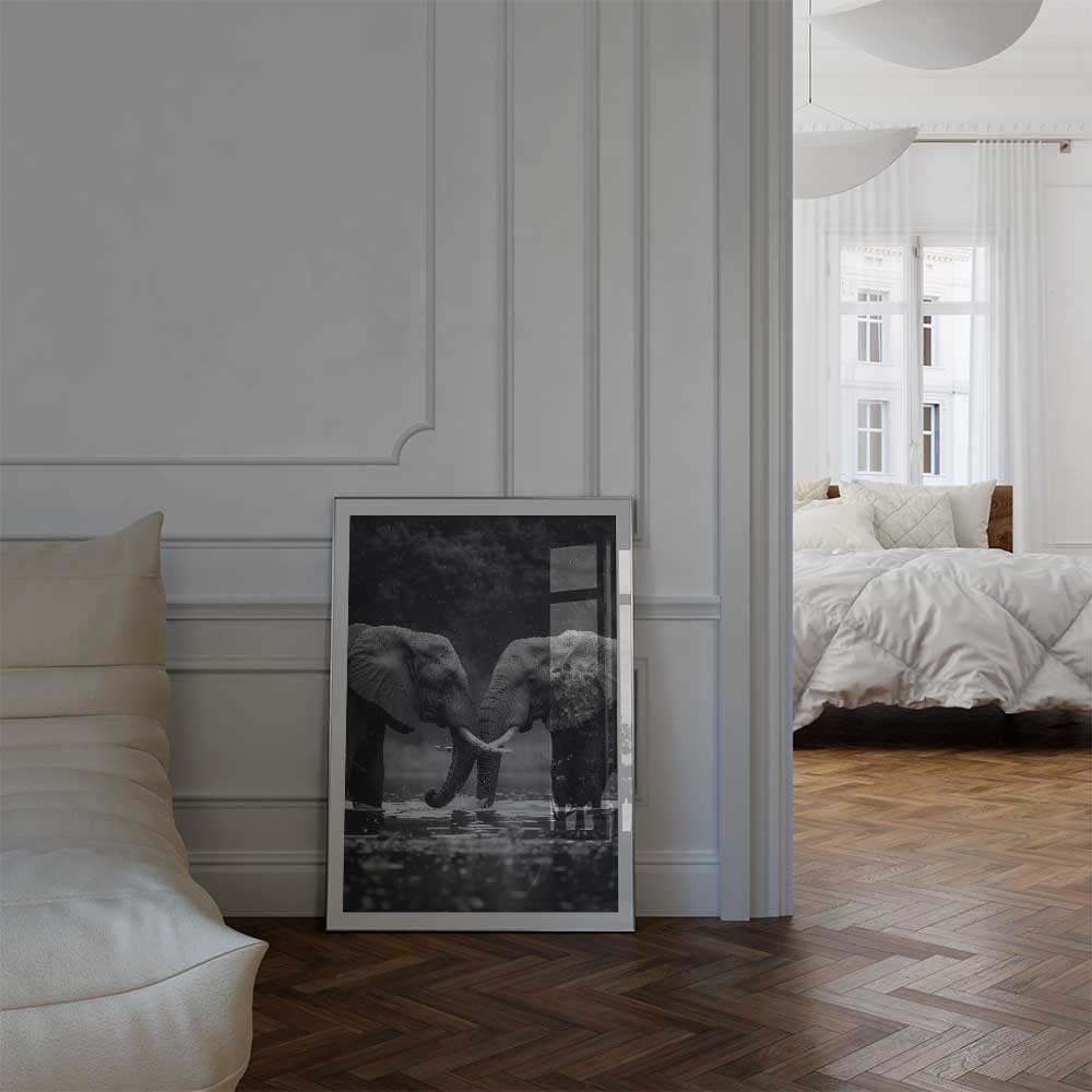 Experience the profound connection of Africa’s wilderness with this captivating wall print, featuring two African Elephants standing head to head in a serene river scene. This portrait captures their gentle strength and unity against a stunning natural backdrop.