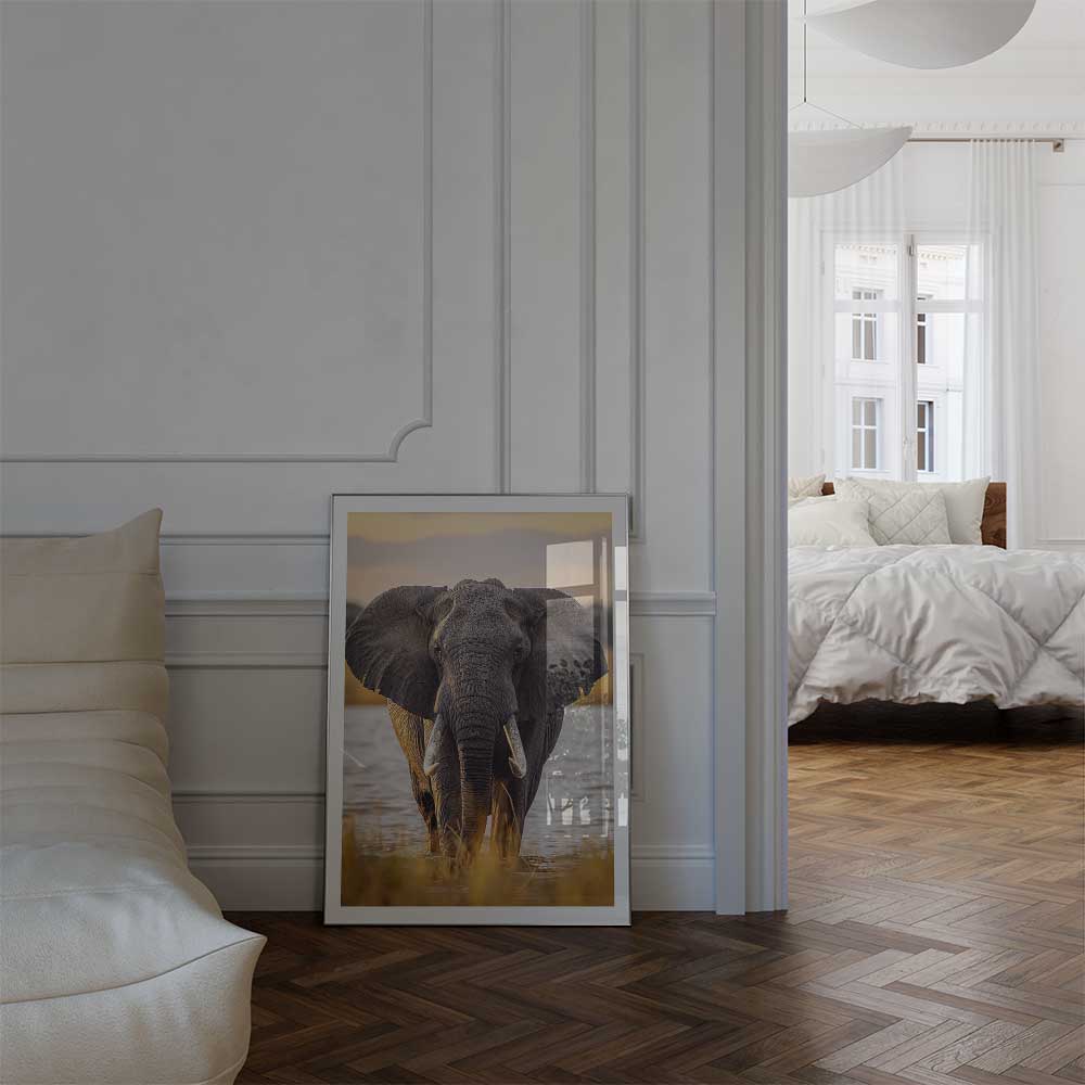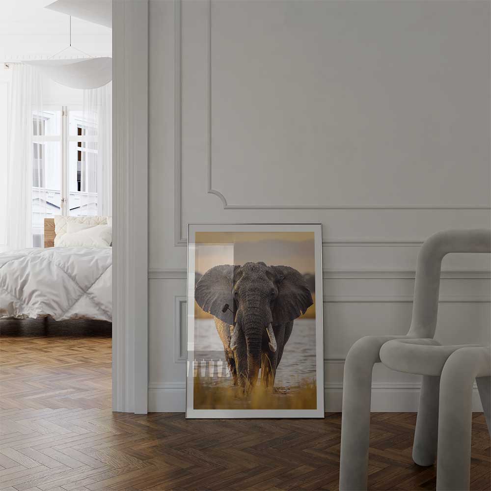 Capture the untamed beauty of Africa with this striking wall print, featuring an African Elephant walking gracefully through one of Africa’s vast rivers. This portrait reflects the elephant’s strength and calm resilience against a backdrop of natural wilderness.
