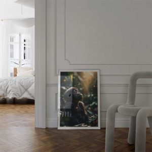 Step into the heart of the forest with this touching portrait of a baby gorilla nestled among the trees, surrounded by the vibrant greenery of its natural habitat, looking upwards while a streak of light paints its face. This artwork captures the endearing innocence and quiet curiosity of one of nature’s most cherished creatures.