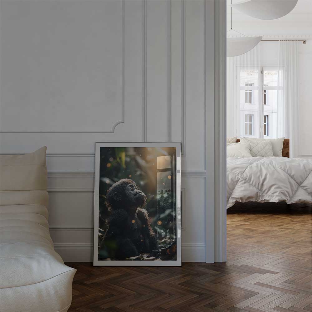 Step into the heart of the forest with this touching portrait of a baby gorilla nestled among the trees, surrounded by the vibrant greenery of its natural habitat, looking upwards while a streak of light paints its face. This artwork captures the endearing innocence and quiet curiosity of one of nature’s most cherished creatures.