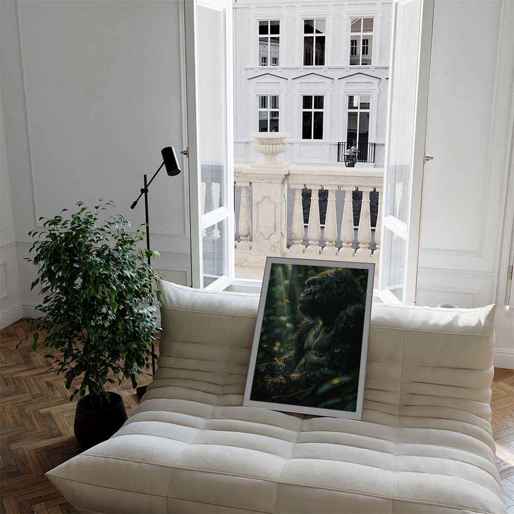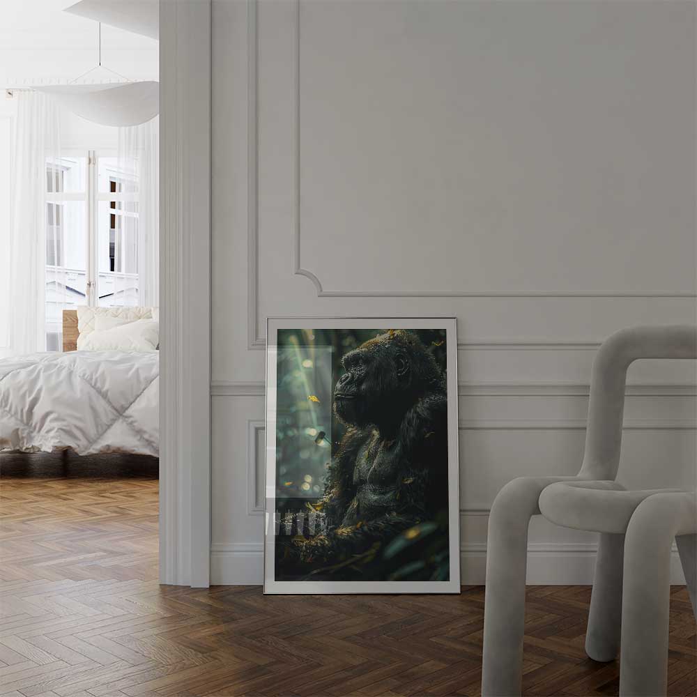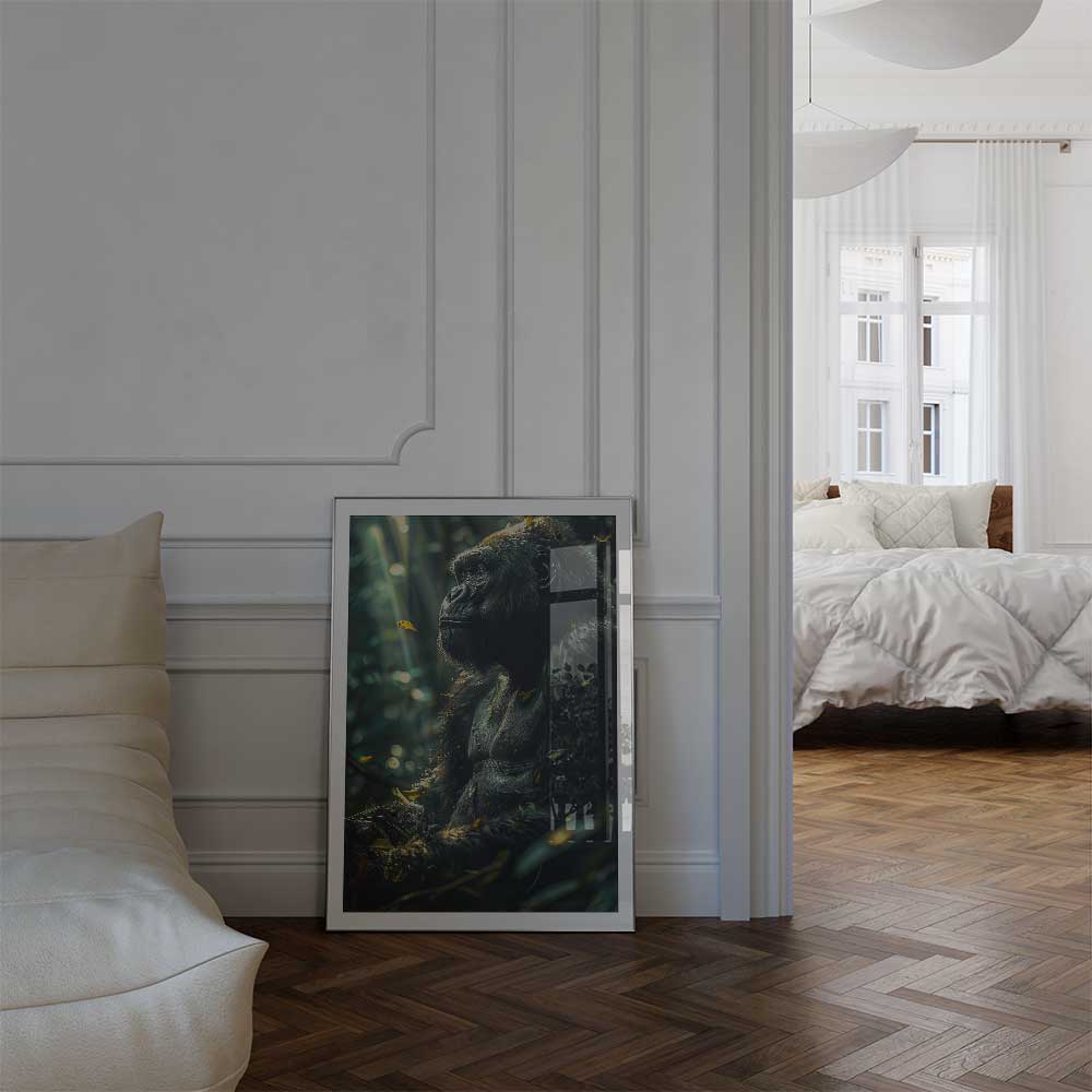 Immerse yourself in the majestic beauty of the wilderness with this stunning portrait of a gorilla resting in a forest, illuminated by streaks of light streaming through the canopy. This artwork captures the gorilla’s commanding presence and the serene magic of its natural environment.