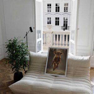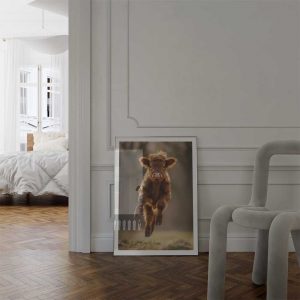 Immerse yourself in the rugged charm of the Scottish Highlands with this striking wall print of a Highland cow calf, running and leaping, in a sunny Scottish glen.