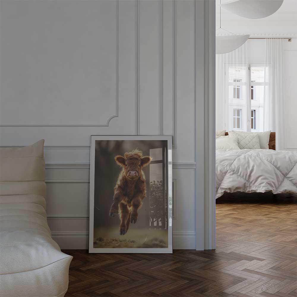 Immerse yourself in the rugged charm of the Scottish Highlands with this striking wall print of a Highland cow calf, running and leaping, in a sunny Scottish glen.
