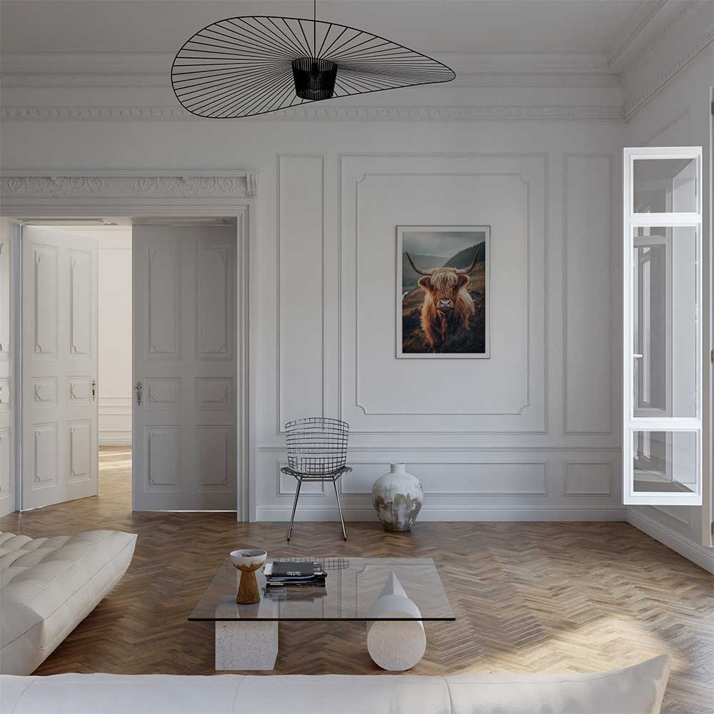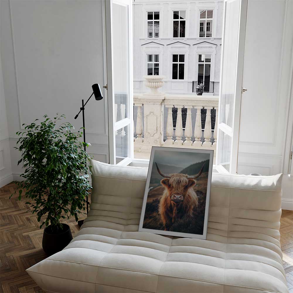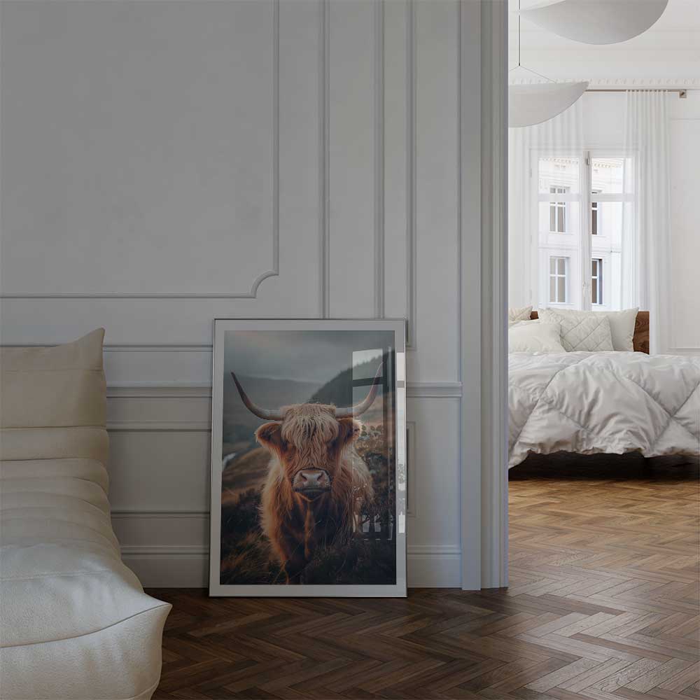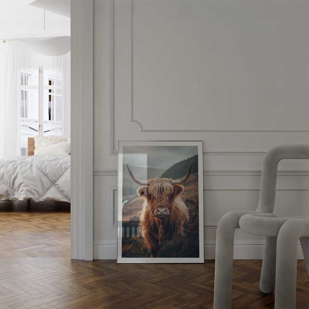 Immerse yourself in the rugged charm of the Scottish Highlands with this striking wall print of a Highland cow, standing proudly amidst the natural beauty of its homeland.