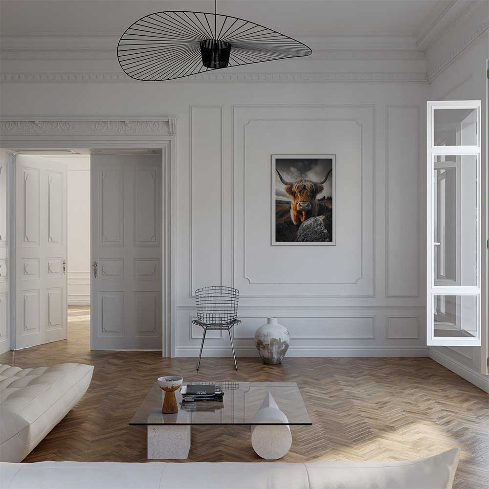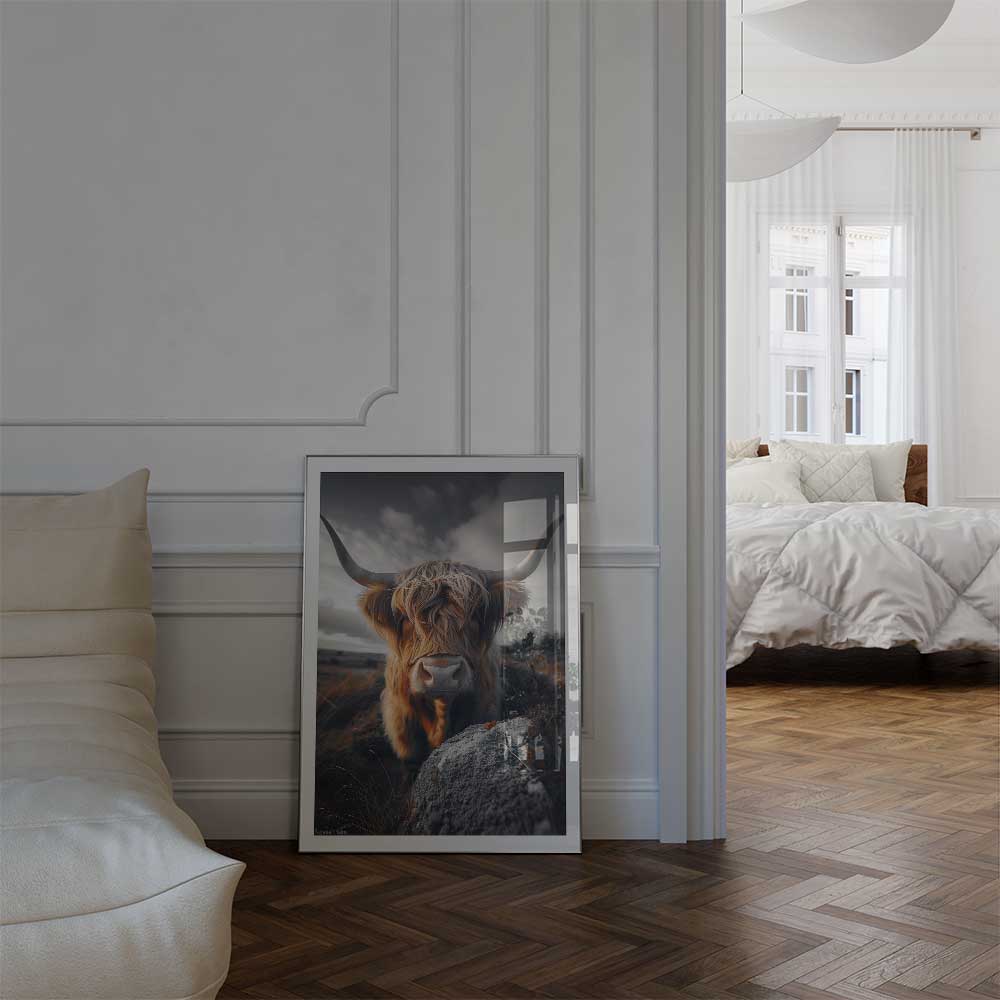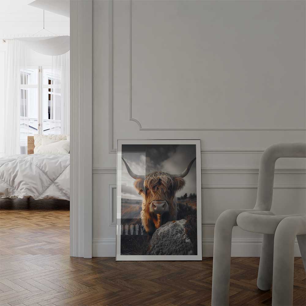 Immerse yourself in the rugged charm of the Scottish Highlands with this striking wall print of a Highland cow, standing proudly amidst the natural beauty of its homeland.