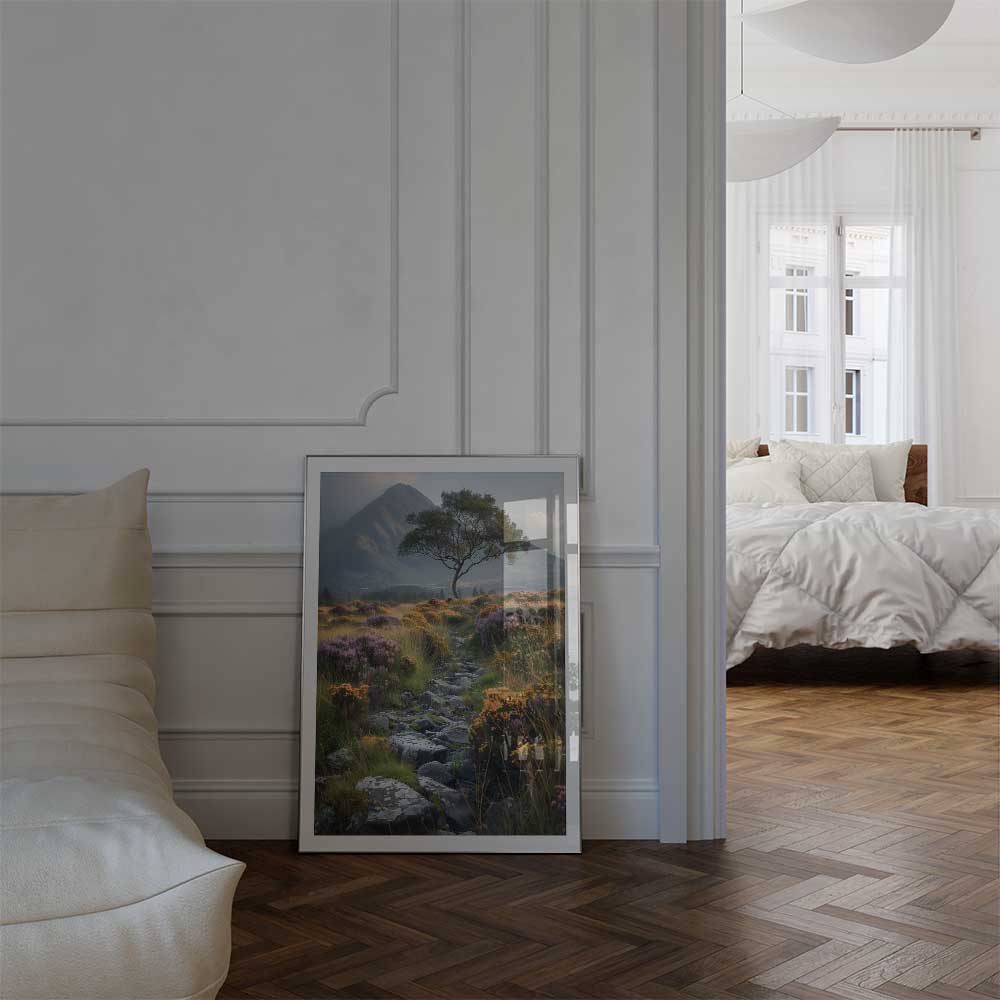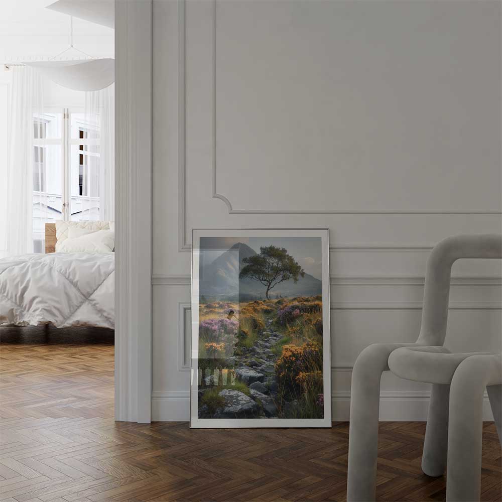Embrace the wild beauty of the Scottish Highlands with this captivating wall print, showcasing a rugged rocky path winding through vibrant heather, with towering mountains in the background.
