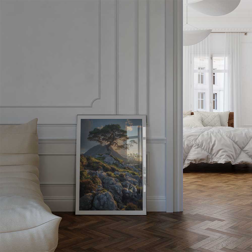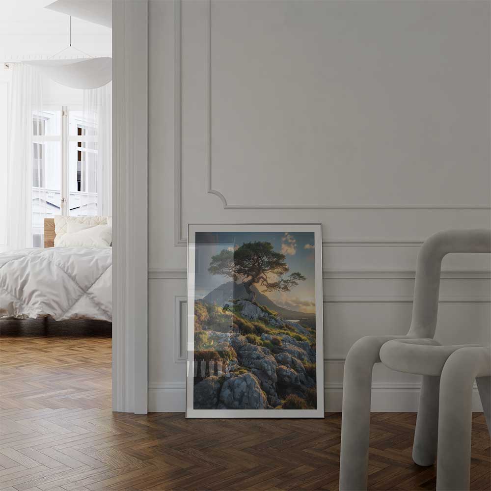 Experience the breathtaking beauty of the Scottish Highlands with this stunning wall print, capturing a lone tree perched atop rugged rocks, bathed in the soft glow of a sunrise with majestic mountains rising in the background.
