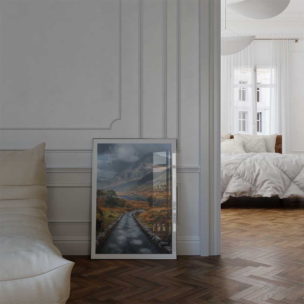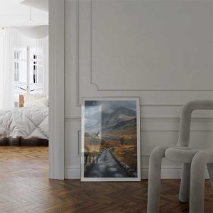 Immerse yourself in the breathtaking beauty of the Scottish Highlands with this captivating wall print, showcasing a winding road that curves its way through the rugged Scottish highlands, framed by towering mountains.
