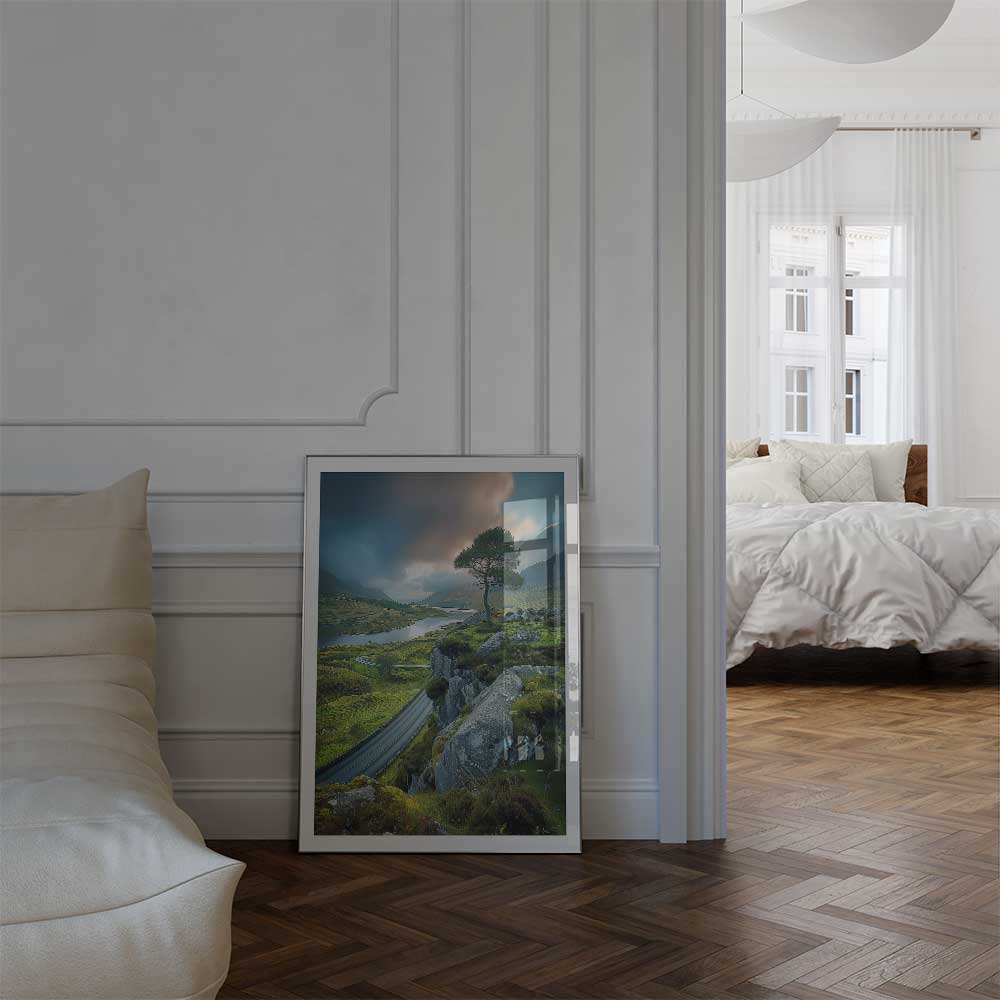 Immerse yourself in the breathtaking beauty of the Scottish Highlands with this captivating wall print, showcasing a winding road that curves around a tranquil loch, framed by towering mountains and a lone tree on the edge.