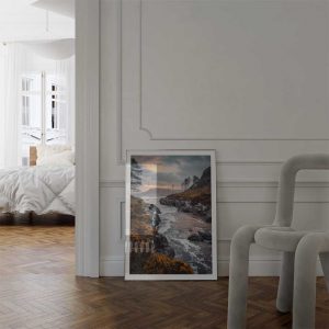 Immerse yourself in the captivating beauty of the Scottish Highlands with this stunning wall print, featuring a river flowing through rocky banks into the sea, framed by vibrant autumn trees and distant mountains.