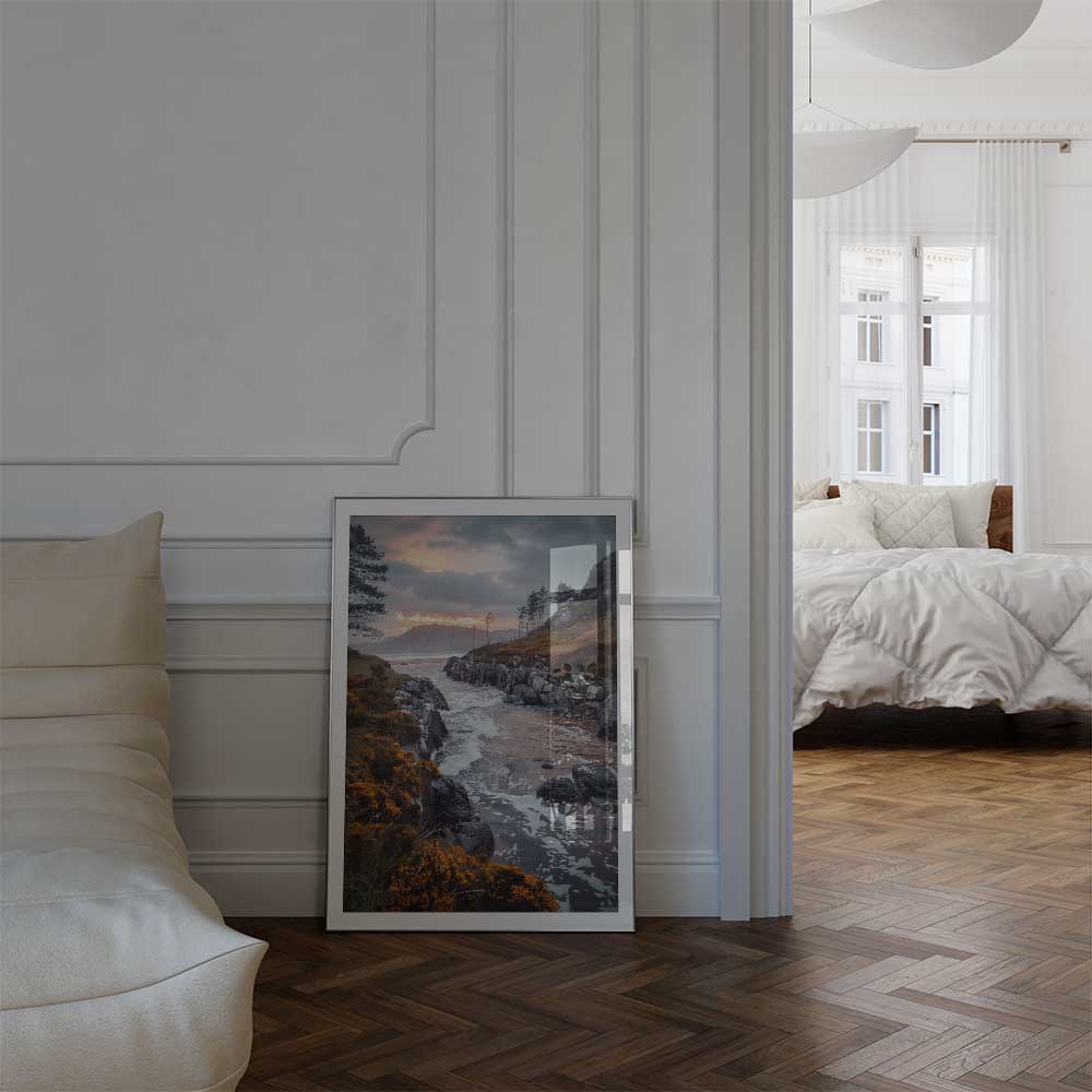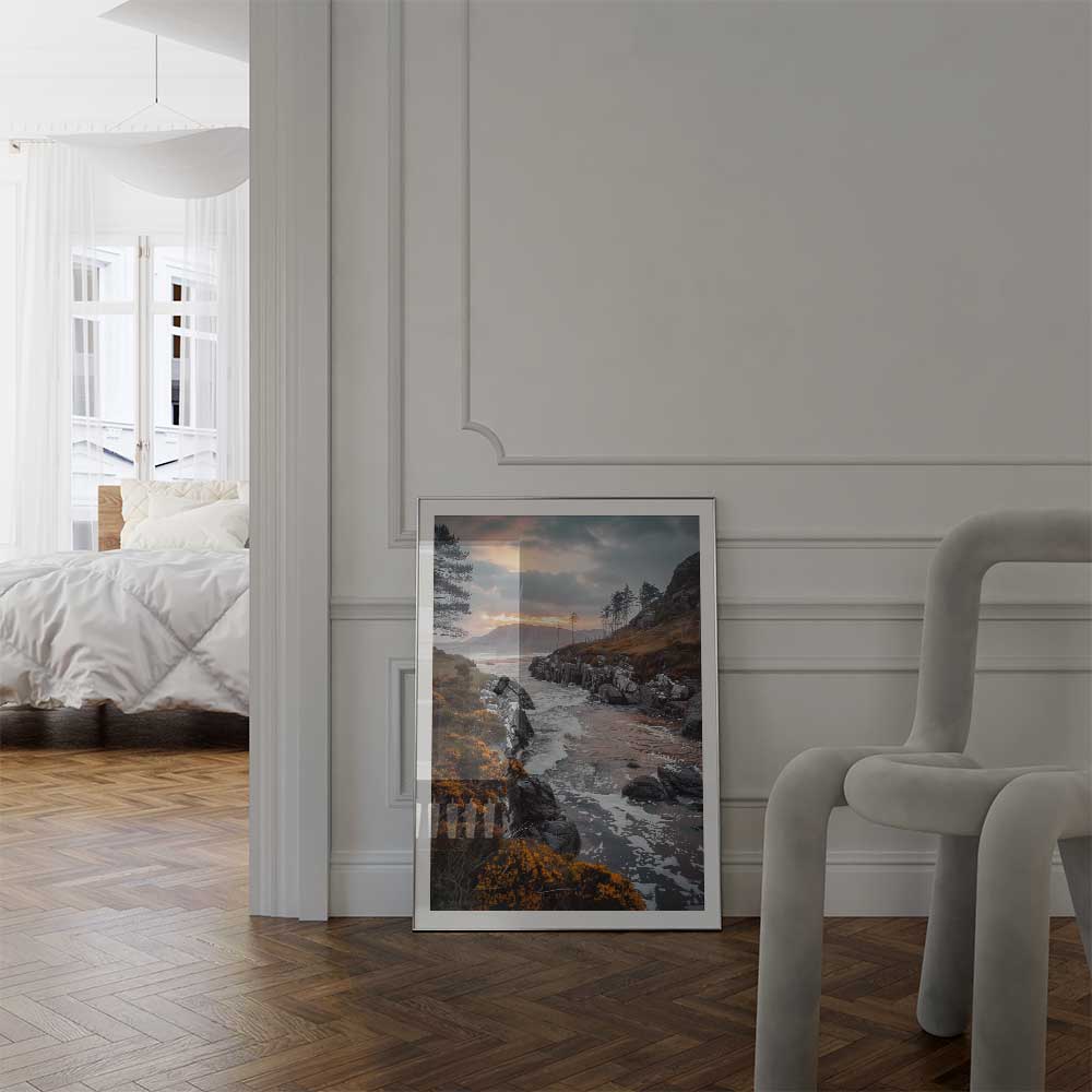 Immerse yourself in the captivating beauty of the Scottish Highlands with this stunning wall print, featuring a river flowing through rocky banks into the sea, framed by vibrant autumn trees and distant mountains.
