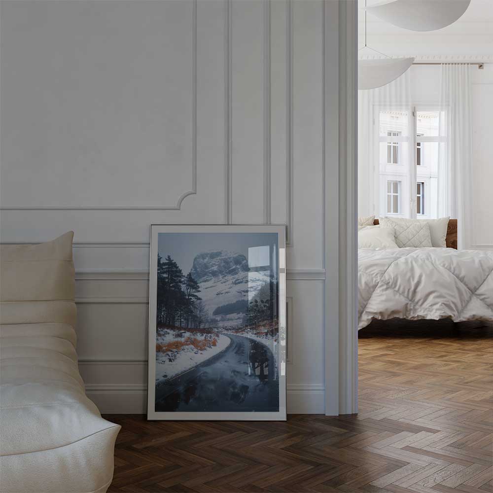 Experience the breathtaking beauty of the Scottish Highlands with this captivating wall print, showcasing a winding road cutting through snow-covered mountains, capturing the serene majesty of winter in the Highlands.
