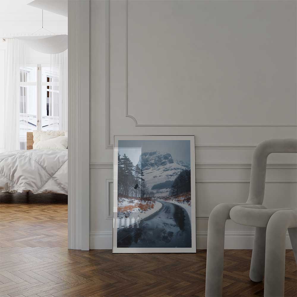 Available in sizes A4, A3, A2, and A1, this print brings the crisp, rugged charm of Scotland’s iconic winter landscapes into any space, offering a glimpse of the Highlands blanketed in quiet snowfall.