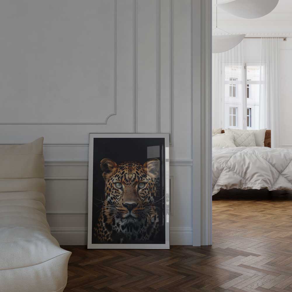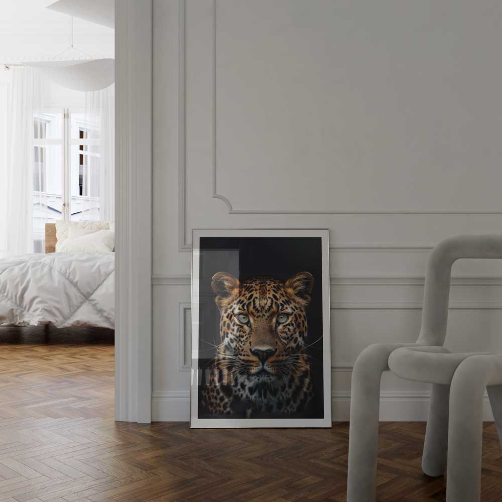 Immerse yourself in the mesmerizing gaze of a leopard with this striking wall print, featuring a close-up portrait set against a deep black background. The image captures every detail of the leopard’s intense stare, highlighting its piercing eyes and majestic, powerful features.
