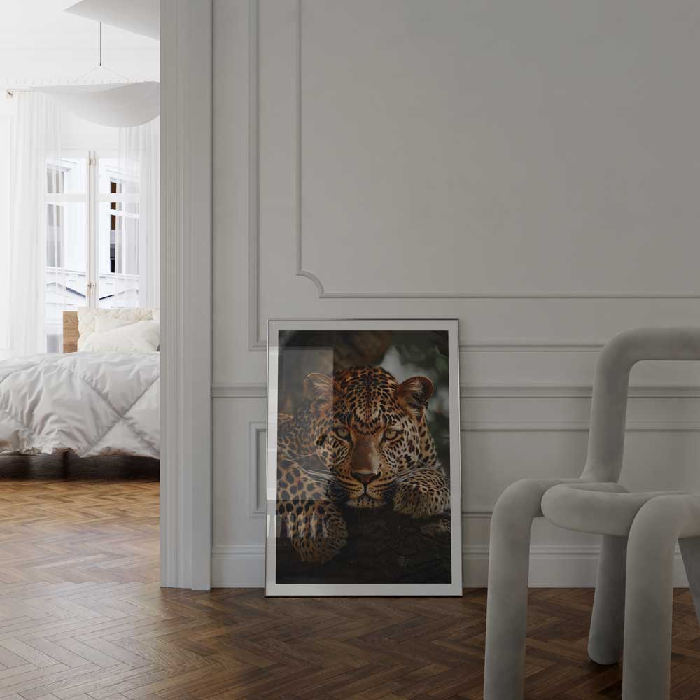 Capture the fierce elegance of the wild with this mesmerizing portrait of a leopard perched in a tree, gazing directly at you. This print invites the intense connection between predator and viewer, showcasing the leopard’s strength, grace, and allure.