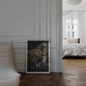 Capture the intense beauty of the African wild with this striking wall print featuring a close-up portrait of a leopard gazing off into the distance. This image offers an intimate look at the leopard’s mesmerizing gaze and sleek, powerful features.