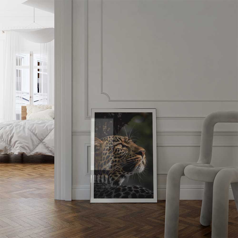 Capture the intense beauty of the African wild with this striking wall print featuring a close-up portrait of a leopard gazing off into the distance. This image offers an intimate look at the leopard’s mesmerizing gaze and sleek, powerful features.