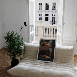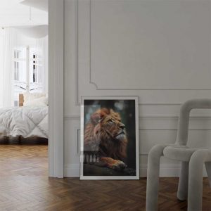 Bring the majestic presence of the African savanna into your home with this stunning portrait of a lion, capturing its regal gaze and powerful features.