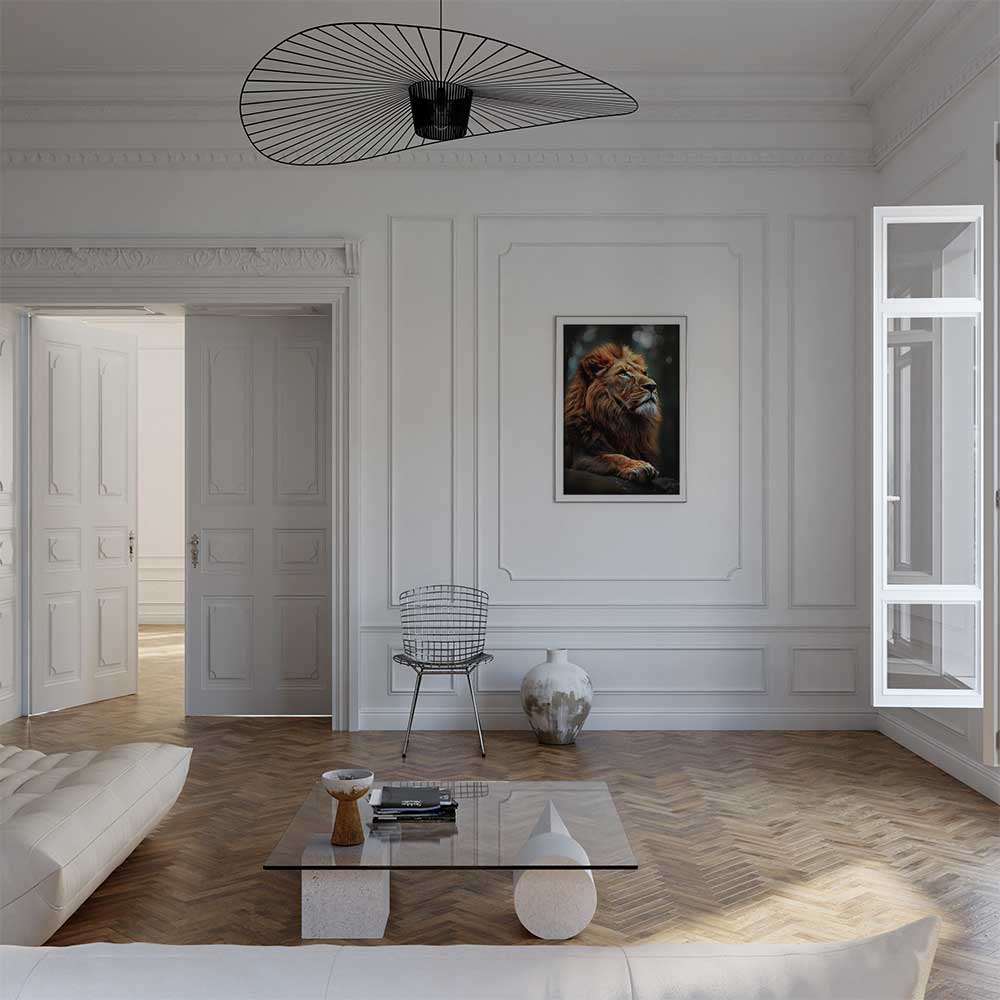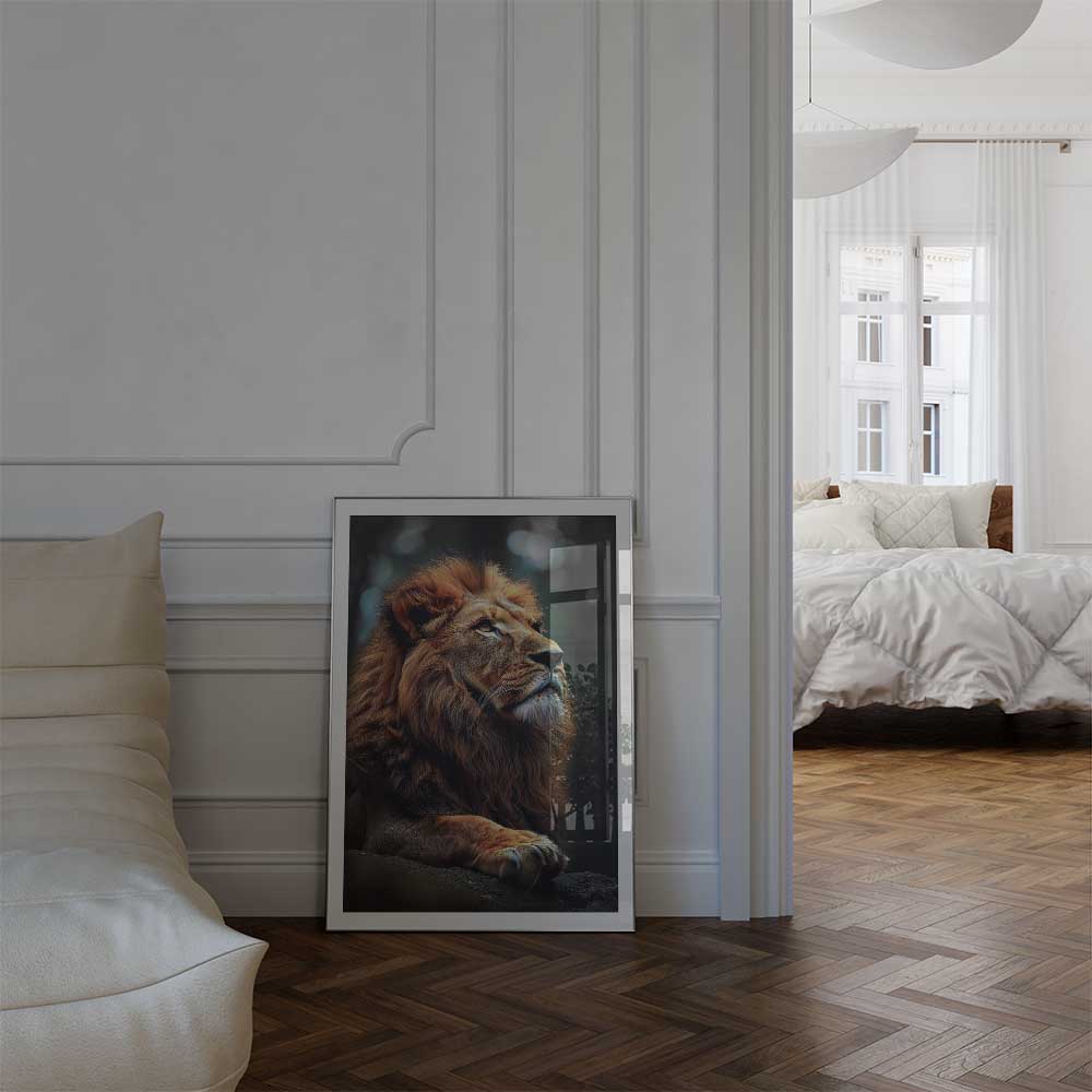 Bring the majestic presence of the African savanna into your home with this stunning portrait of a lion, capturing its regal gaze and powerful features.