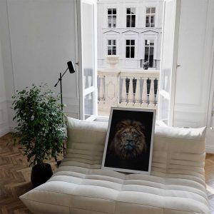 Bring the majestic presence of the African savanna into your home with this stunning portrait of a lion, capturing its regal gaze and powerful features.