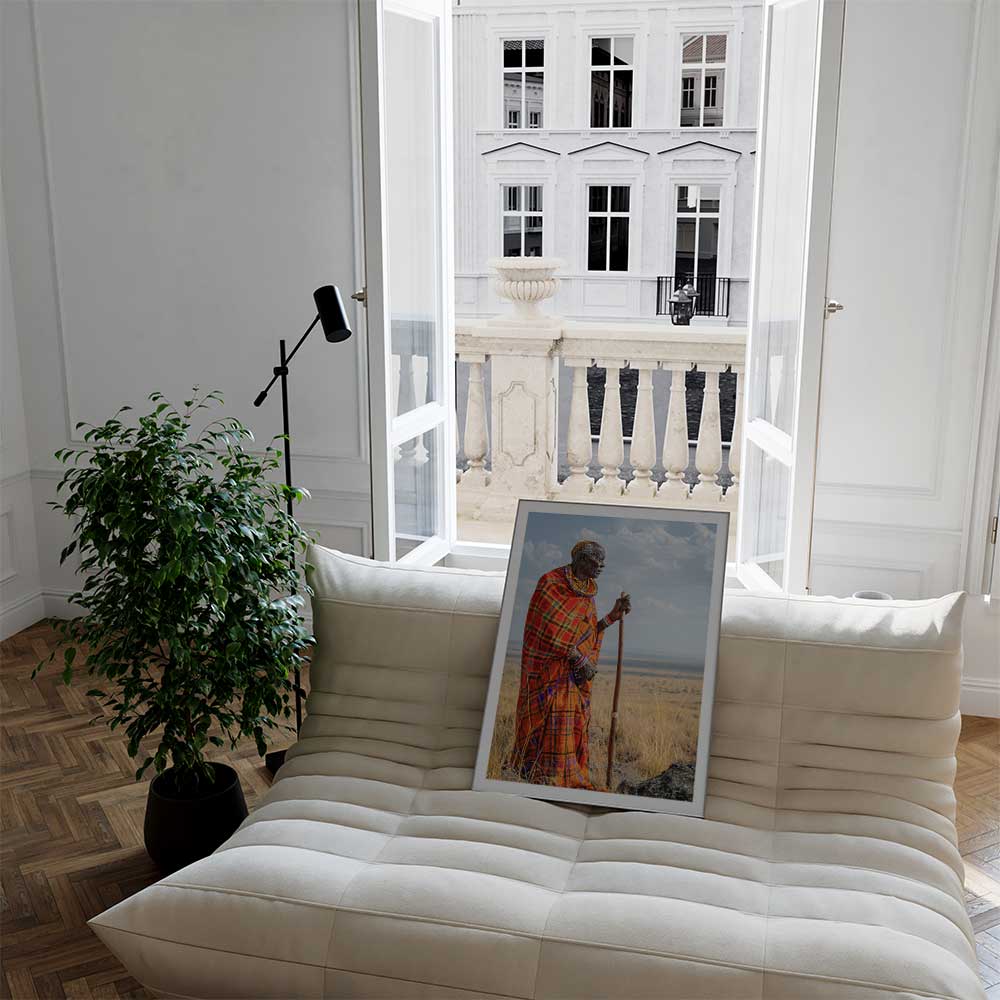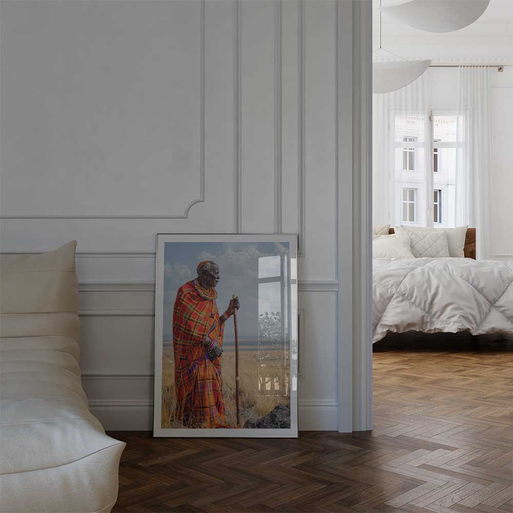 Capture the wisdom and strength of tradition with this powerful portrait of a Maasai elder, standing proudly in the vast plains with his walking stick. His weathered features and timeless attire speak of a life intertwined with the land, embodying resilience and heritage.