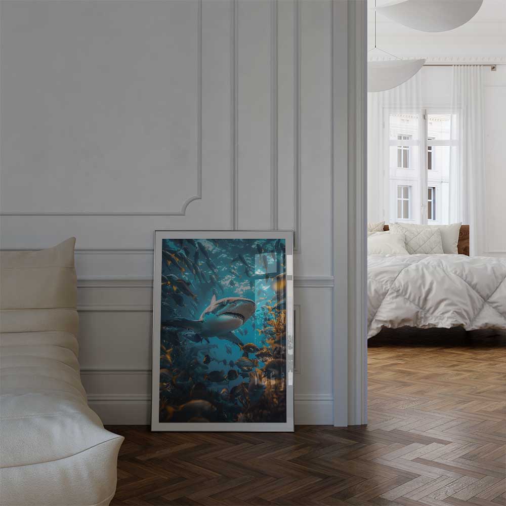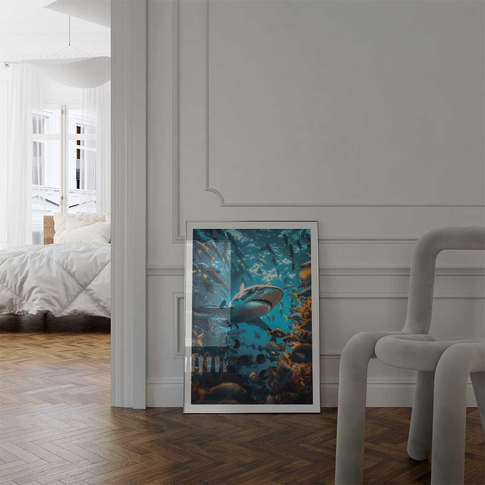 Available in sizes A4, A3, A2, and A1, this print brings the serene majesty of the oceanic whitetip shark into your space, offering a striking and dynamic focal point.