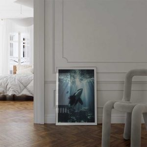 Discover the serene beauty of Scotland’s coast with this captivating wall print of an orca, swimming gracefully through its natural habitat.