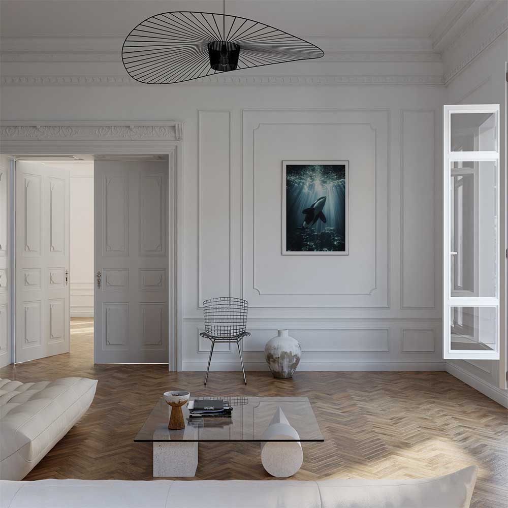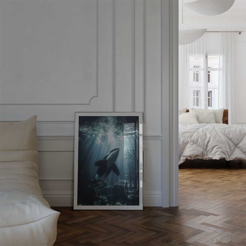 Discover the serene beauty of Scotland’s coast with this captivating wall print of an orca, swimming gracefully through its natural habitat.