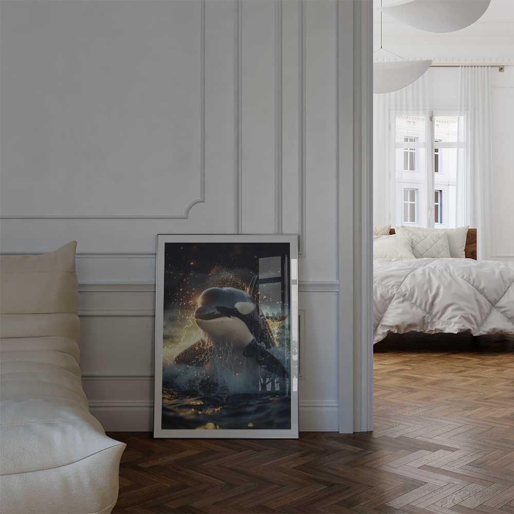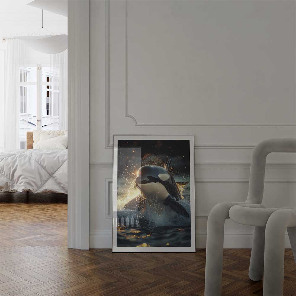 Discover the serene beauty of Scotland’s coast with this captivating wall print of an orca, gliding gracefully through its natural habitat.