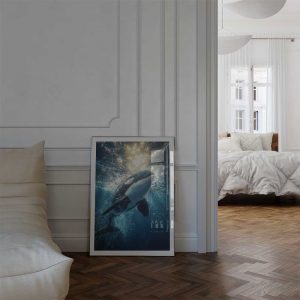 Discover the serene beauty of Scotland’s coast with this captivating wall print of an orca, gracefully swimming through its natural habitat.