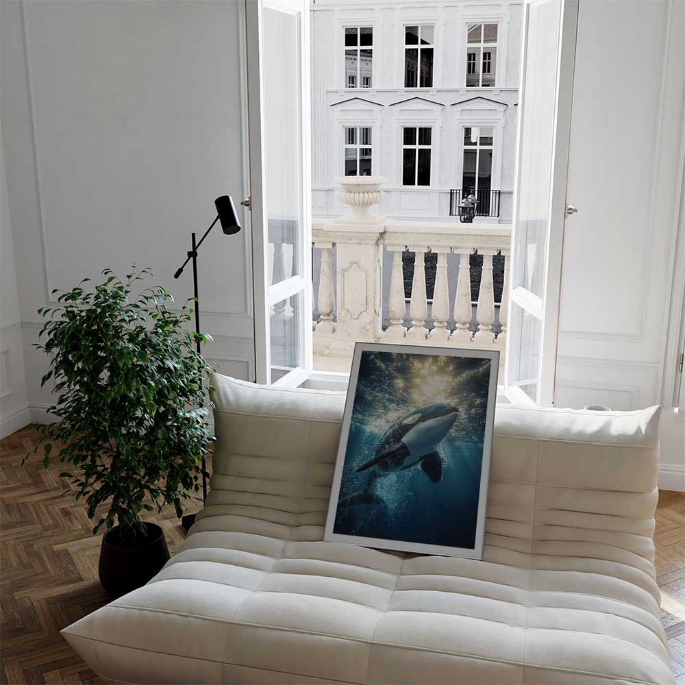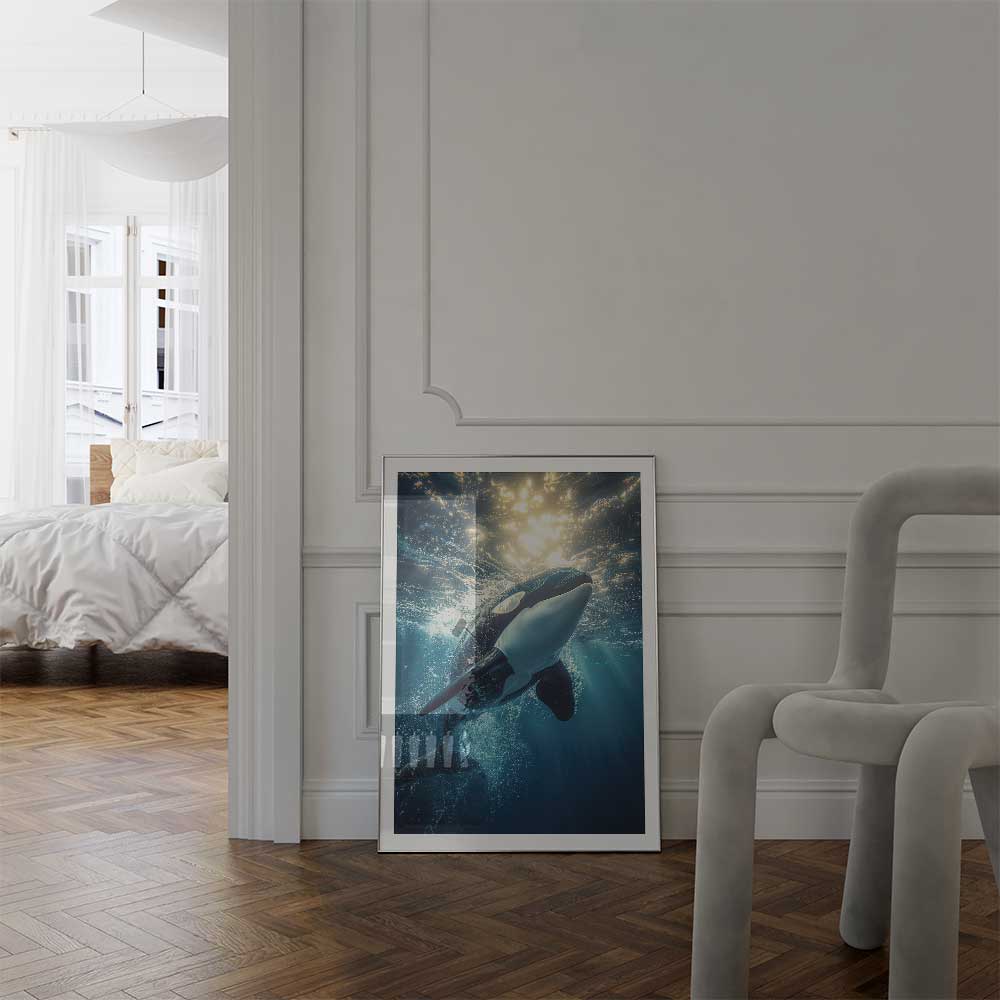Discover the serene beauty of Scotland’s coast with this captivating wall print of an orca, gracefully swimming through its natural habitat.