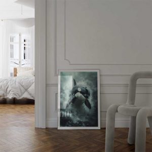 Discover the serene beauty of Scotland’s coast with this captivating wall print of an orca, gliding gracefully through its natural habitat.