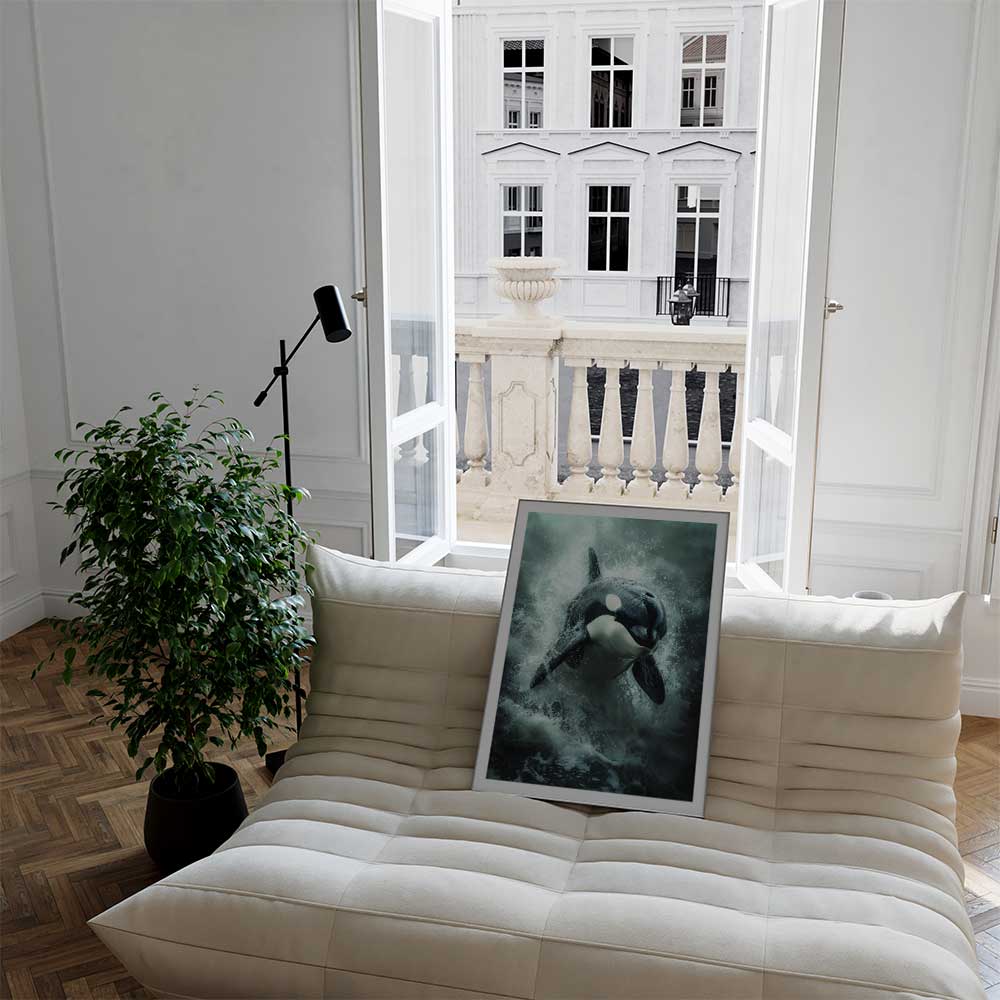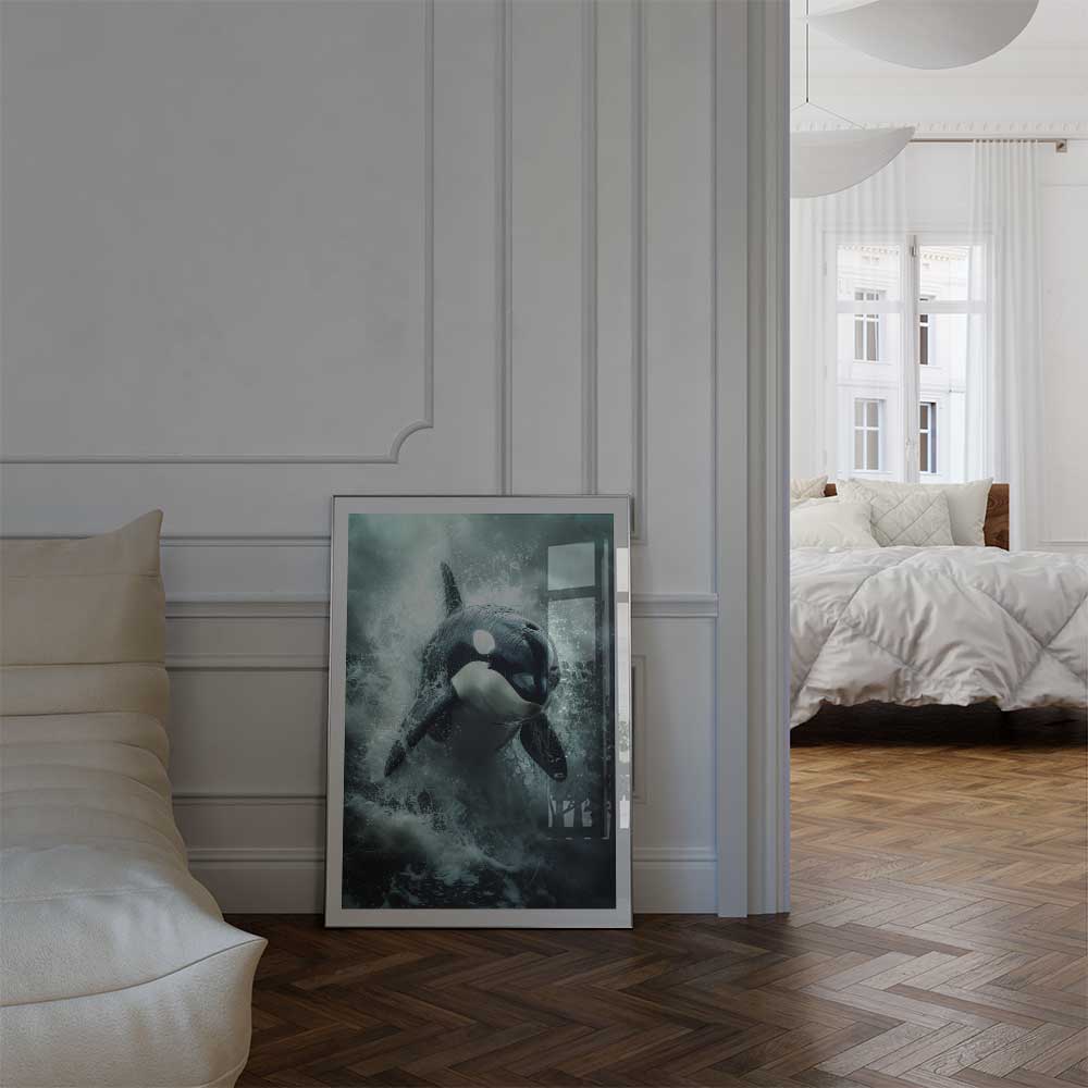 Discover the serene beauty of Scotland’s coast with this captivating wall print of an orca, gliding gracefully through its natural habitat.